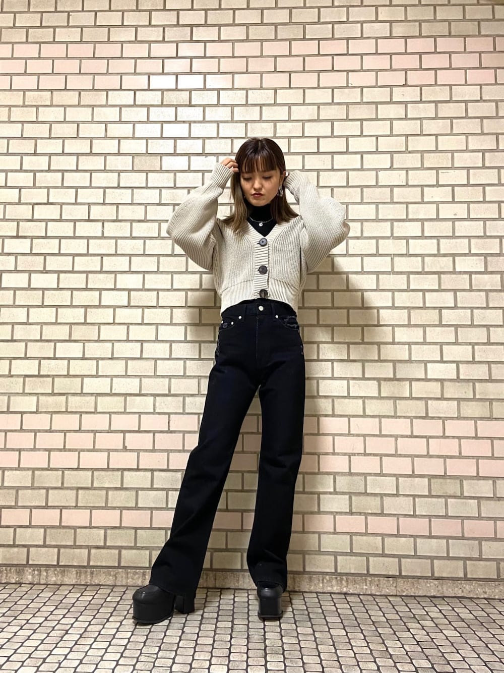 ボリュームスリーブがかわいいショートニットカーディガン❤︎ 肩がゆったりしているのでレイヤードしていただきやすいタイプです♩1枚で着ても羽織りとしても使いやすいので、着回し◎です⭐︎厚手すぎないので、春先にも使えます♩スカートコーデにもおすすめです❤︎ 中に着たニットは、伸縮性があるリブタイプ♩首元、裾がクラッシュになっているのがポイント❤︎フィット感があるのでインナーとして使いやすいです⭐︎ワンピースのインナーなどにもおすすめです❤︎ ボトムはハイウエストのフレアジーンズ♩ 程よくダメージが入ってるヴィンテージ加工です❤︎ シルエットがキレイなので、カジュアルはもちろん、キレイめなイメージにも使えます⭐︎フレアシルエットがキレイなので、厚底で合わせていただくとより美脚効果抜群なのでおすすめです❤︎