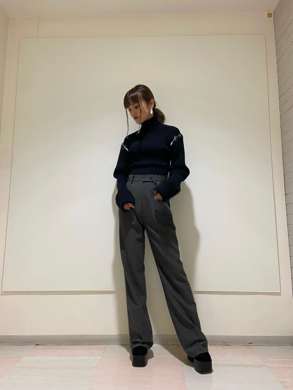 シンプルモードコーデ❤︎ 【ニット】ショルダーがジップになったデザインニット♩開閉可能なので開けて着ていただくと、チラッと肌見せがポイントになり、女性らしさをプラスしてくれます❤︎パンツinしてるのですが、ウエスト部分はタイト目なつくりになってるので、引き締め効果もあり、スタイルアップ◎♩デザインニットは、シンプルなボトムスで合わせていただくのがおすすめです⭐︎ 【パンツ】センタープレスになっていて、大人で上品なイメージで履いていただけるパンツです⭐︎メンズライクな生地感とシルエットなので、トップスはすっきり目で合わせていただくと、バランス良く着ていただけます❤︎ショート丈のカットソーや、プルオーバーと合わせていただくと、都会的な外国人風のイメージで着ていただけるのでお洒落に着こなせます❤︎ 【ブーツ】サイドゴアの厚底ブーツ♩ヒールは全サイズ共通の11cmなので美脚効果抜群!!ヒールがフレアシルエットなので長めのパンツと合わせた時の、横から見える形もかわいいです!❤︎前底も高めで、つま先に重心がいかないので疲れにくく、履いていただきやすいです❤︎