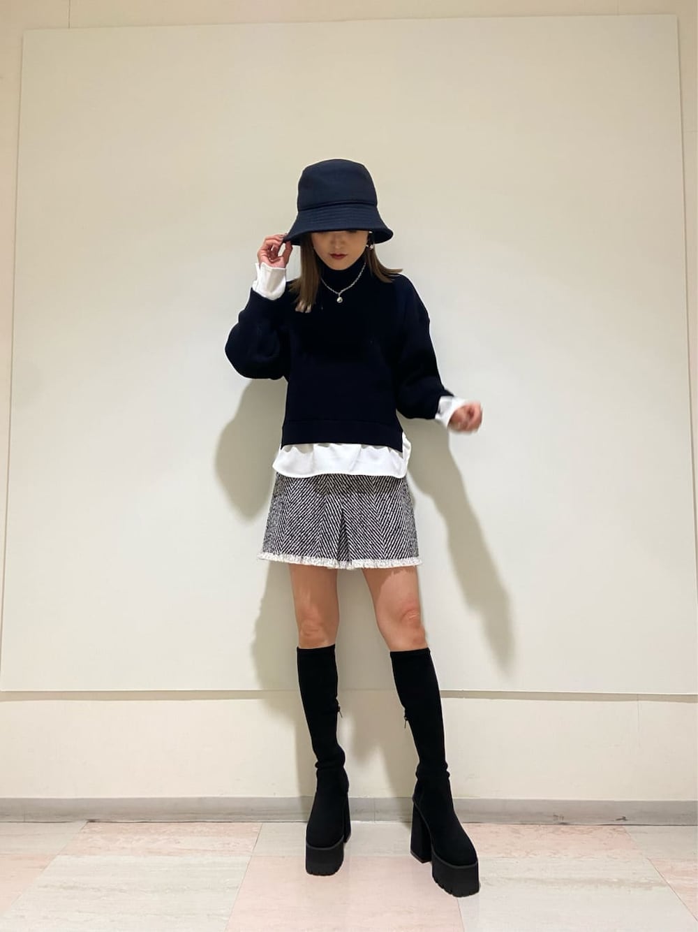 【ニット】春先まで使えるニットとシャツがドッキングになったデザイン❤︎1枚でお洒落見えするのでシンプルなコーデにも映えます♩後ろがリボンになっているので、シュッとさせたいときは少し絞りめで結んでいただくと◎です⭐︎私でヒップが隠れるか、隠れないかくらいの丈感なので、ゆったりめのボトムスでも合わせていただけます❤︎ 【スカート】ハイウエストデザインのスカート❤︎タックが正面にあることで、ショートパンツのようなデザインになっています⭐︎内側には、インナーショートパンツが付いているので、ラインも出すぎず、身動きしやすいです❤︎丈感は、156cmの私で拳2個分くらいで、太ももが見える範囲的に1番足が細く見える丈感でした❤︎ 【ブーツ】毎年大人気のニーハイブーツが、丈感を変えて登場しました!フィット感があるので、脚をシュッと引き締めてくれます❤︎ヒールは12〜13cmですが、前底もあるので安定感があります⭐︎丁度膝下の丈感だったので、ミニボトムスと合わせるとより脚をキレイに見せてくれたので相性抜群でした♩