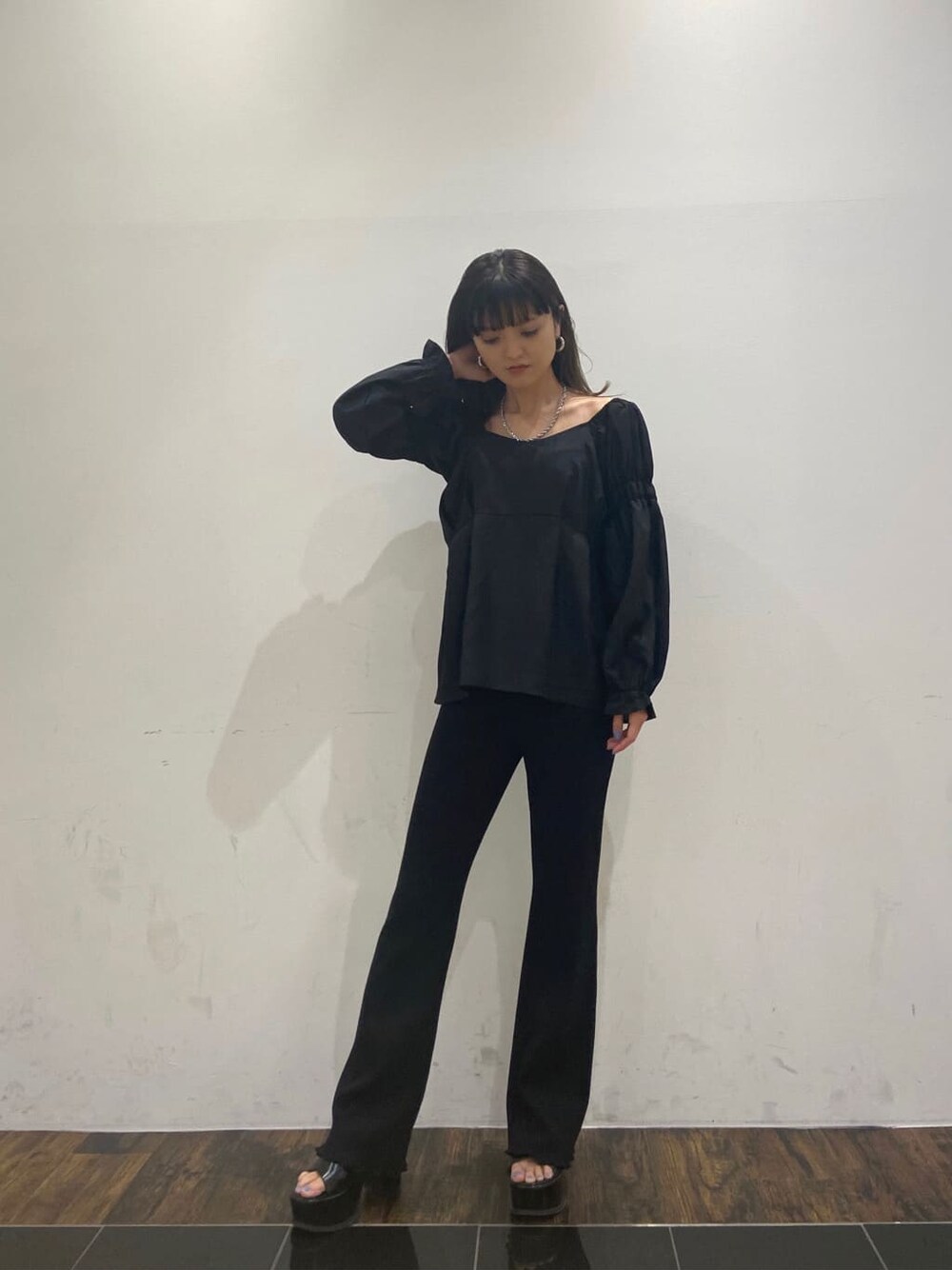 オールブラックで大人女子❤︎ 【トップス】ギャザーが切り替えになり、華奢見えするデザインです❤︎肩を下げてオフショルダーとしても着れる2WAYとなっております❤︎袖にもゴムが入っているので肘まで上げていただれば、五分袖としても着れるので温度調節がしやすく晩夏の季節にも万能です❤︎ 【ボトムス】ウエスト総ゴムで履きやすさ抜群パンツ⭐︎フレアシルエットもキレイなので、足を細く長く見せてくれます❤︎薄手過ぎないのでオールシーズン履いていただけます⭐︎丈感は、私の身長でスニーカー履いても、擦らないで履ける長さでした! 【シューズ】前底にも厚みがあり、安定感抜群の厚底サンダル❤︎見た目に比べて軽いです!!合皮なので、履いていくうちに横幅は馴染んで柔らかくなりますよ⭐︎ソックスを合わせて履いていただくのもおすすめ!ヒールは全サイズ11cmです⭐︎