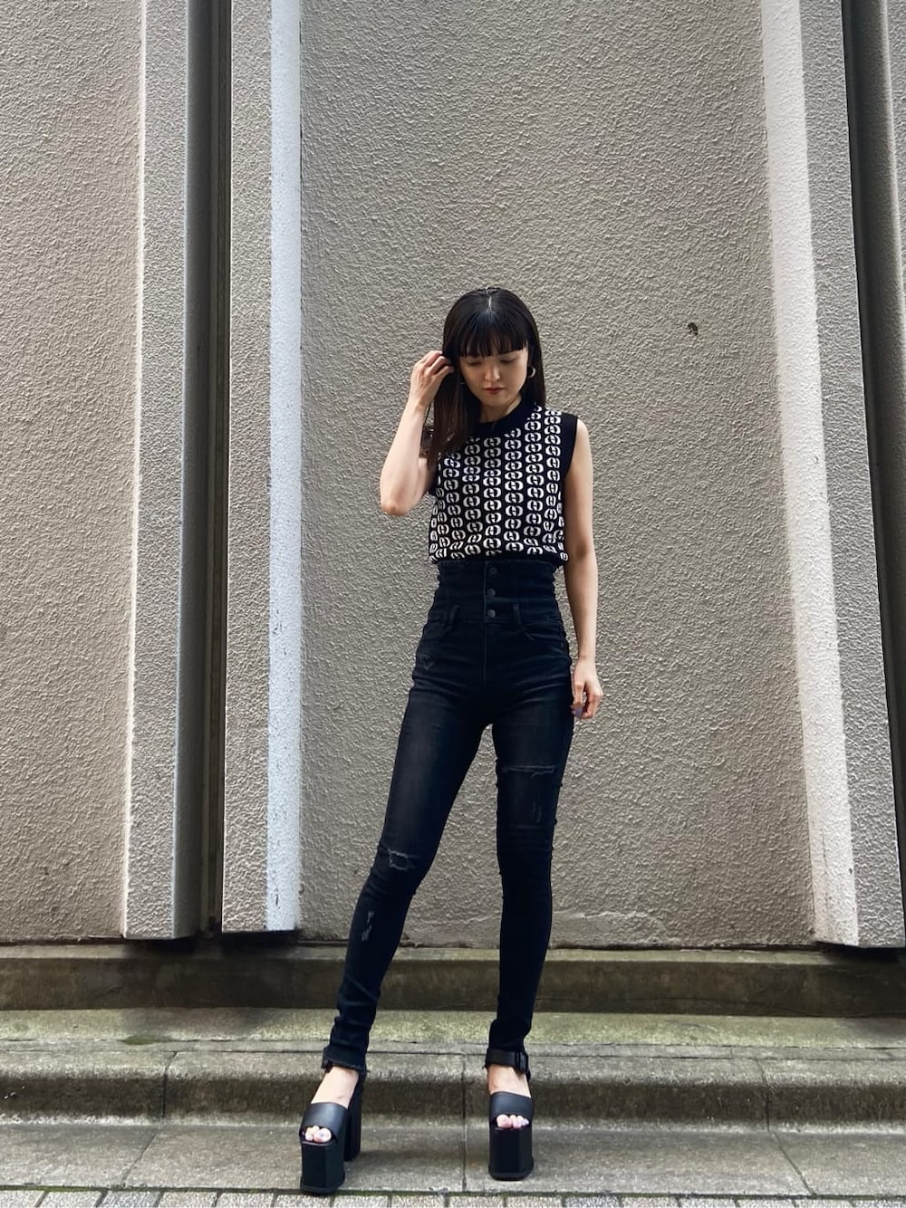 モノトーンコーデ❤︎ 【トップス】今季のEMODAオリジナル柄、モノグラムシリーズ❤︎ニットでもサラッとした素材で薄手なので、夏でも着やすいです!脇下に少し余裕があるので、Tシャツなどとレイヤードして着ていただくのもおすすめです❤︎ 【デニム】後ろのレースアップがポイントのスキニーハイウエストデニム⭐︎コルセットベルトのような役割をしてくれるので、腰回りがすっきりと引き締まって見えます❤︎レースアップは、ある程度微調整できるので、お好きなサイズ感で着れます⭐︎シンプルなトップスとの相性◎⭐︎ 【シューズ】毎年大人気のコンビネーションサンダル❤︎ヒールは全サイズ13cmと高めに設定されてるので、どんなボトムスにも合います❤︎前底も7.5cmと、高さがあるので傾斜がなく、安定感があり履いていただきやすいです⭐︎