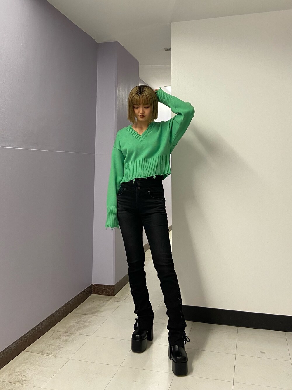 カラーニットコーデ❤︎ 【トップス】チクチク感もなく1枚着やすいです⭐︎おへそギリギリ隠れるくらいのショート丈なのでハイウエストと合わせるのがおすすめです! 【ボトムス】裾のレースアップは調整可能なので、シューズに合わせて履くことができます⭐︎ストレッチ抜群で履きやすいです! 【シューズ】足首が細身のシルエットなので、足を細く長く見せてくれます!11.5cmのヒールですがとても軽くて傾斜を感じないので歩きやすいです⭐︎22.5cmでSサイズを着用しています⭐︎