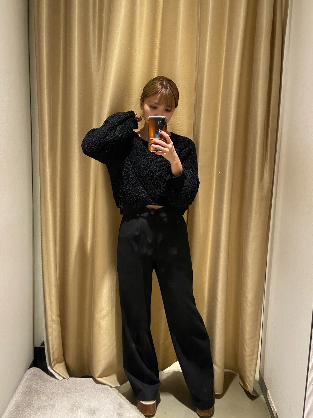 ブラックコーデ 【トップス】モール素材なので、なめらかな肌触りで着心地も◯!前後着用が可能です⭐︎ 【ボトムス】ワイドすぎないシルエットでハイウエストなので、足をキレイに見せてくれるデザイン!トレーナーやシンプルなトップスで合わせてカジュアルに着ていただくのもおすすめです⭐︎ 【シューズ】つま先が丸みあるデザインなので女性らしいデザインです⭐︎カジュアルからキレイめまでどんな系統でも合わせやすいです!22.5cmでSサイズを着用してます。