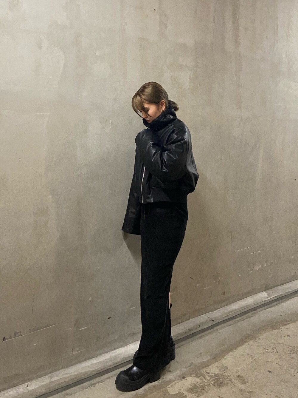 モードコーデ 【アウター】フェイクレザーでアウターがコーデのポイントに⭐︎人気のB3風デザインです!腕周りはゆったりめなので、着込みやすいです!軽くて羽織りやすいのもおすすめポイント! 【ボトムス】ウエストゴムで、ベロア素材で履き心地◎です!うしろスリットがポイント⭐︎ 【シューズ】毎年人気のサイドゴアブーツです⭐︎軽いのでとても履きやすいです!22.5cmでSサイズを着用しています。