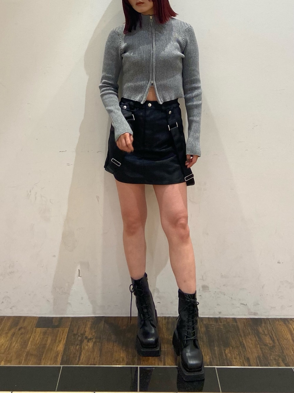 モードコーデ 【トップス】逆開で使える肌見せがポイントのジップニット!リブ素材で伸縮性◎ 【ボトムス】ブルゾンと同素材でセットアップでも着れるスカート!ウエストゴムなのでストレスフリーで着やすいです⭐︎156cmで膝上拳2個分くらいの丈感でした! 【シューズ】EMODAでおすすめのレースアップブーツ!軽くて履きやすいです⭐︎全サイズヒール9cmです!