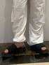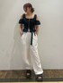カジュアルコーデ 【トップス】肌見せがポイントのトップス⭐︎ナイロン素材で着やすいです!袖のデザインは二の腕カバーしてくれるデザインです⭐︎ 【ボトム】ボディラインを拾わないデザインで、ナイロン素材で軽いので春夏に着やすいです!裾のドロストで丈感調整が可能です⭐︎ 【シューズ】去年も人気だったニットバンドサンダルです⭐︎軽くて履きやすいデザインです!22.5cmでSサイズ着用してます⭐︎