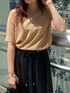 きれいめカジュアル 【ニット】タイトすぎずサラッとした着心地なので夏でも使いやすいニット。1枚でもインナーとしても着回ししやすい1着です。 【ボトムス】ウエストが総ゴムなのでストレスフリーで着用できます♪ラインを拾いすぎないほどよいIラインシルエットなので、体型カバー◎です。156cm02サイズを着用。 【シューズ】低反発クッションが施されてるので、フラットでも歩きやすいです。22.5cmだと37サイズがおすすめです。