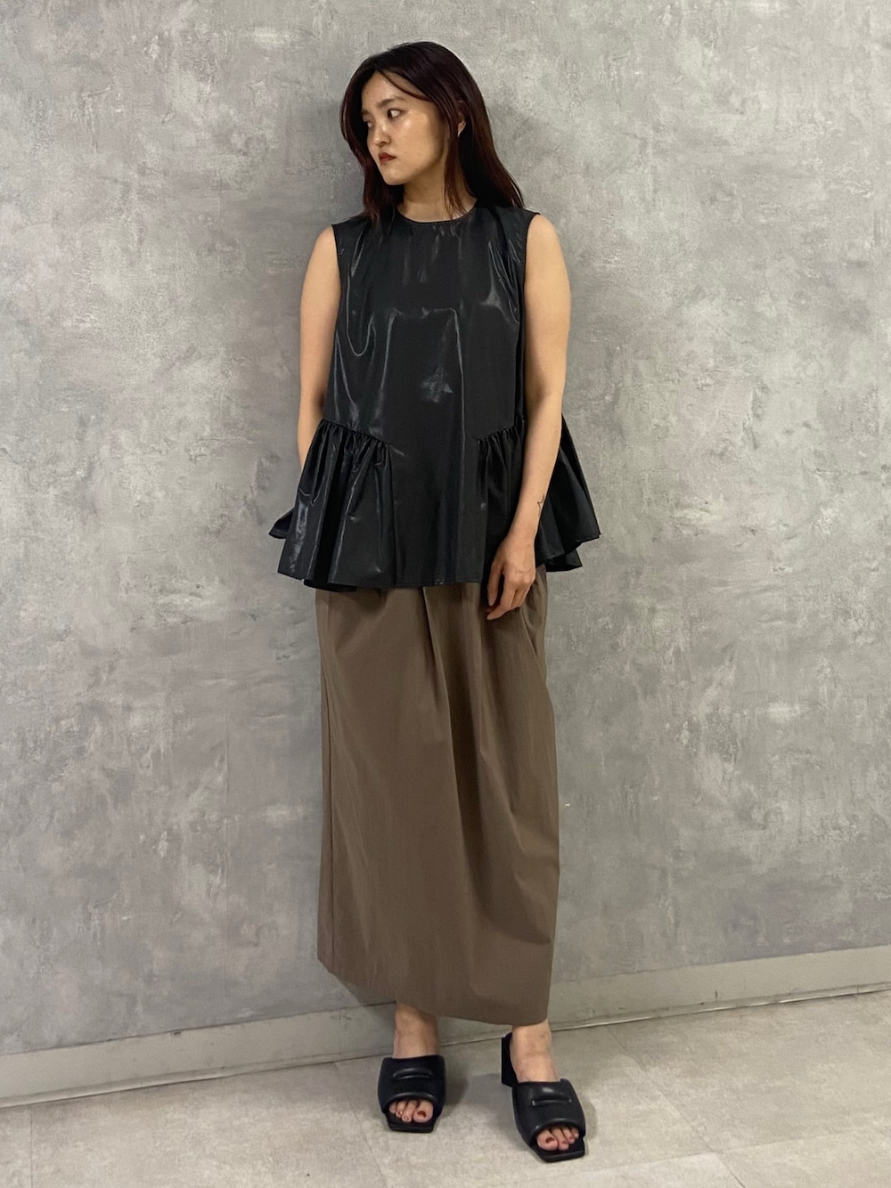 きれいめコーデ 【トップス】生地感はサラっとしていて軽く、夏でも着やすいです。モードにもカジュアルにも着用いただけるデザインです。 【スカート】ヒップ周りのシルエットを拾いにくいバレルシルエットです。156cmで01サイズを着用。 【シューズ】低反発クッションが施されてるので、歩きやすくヒールも高すぎないので歩きやすいです。22.5cmだと37サイズがおすすめです。