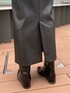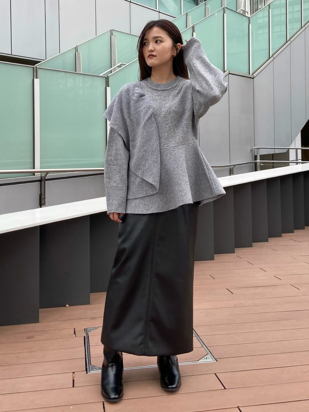 きれいめコーデ 【トップス】去年も人気だったフリルショルダーデザインです。ペプラムなのでウエストの位置を高く、すっきりと見せてくれます。 【ボトムス】フェイクレザーで柔らかく履きやすいです。きれいめにもモードにも使いやすいデザインです。156cmで01サイズを着用。 【シューズ】フラッとな見え感とデザインですが、インソール入りなので歩きやすく、スタイルアップも◎22.5cmで37サイズを着用。