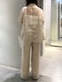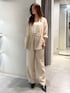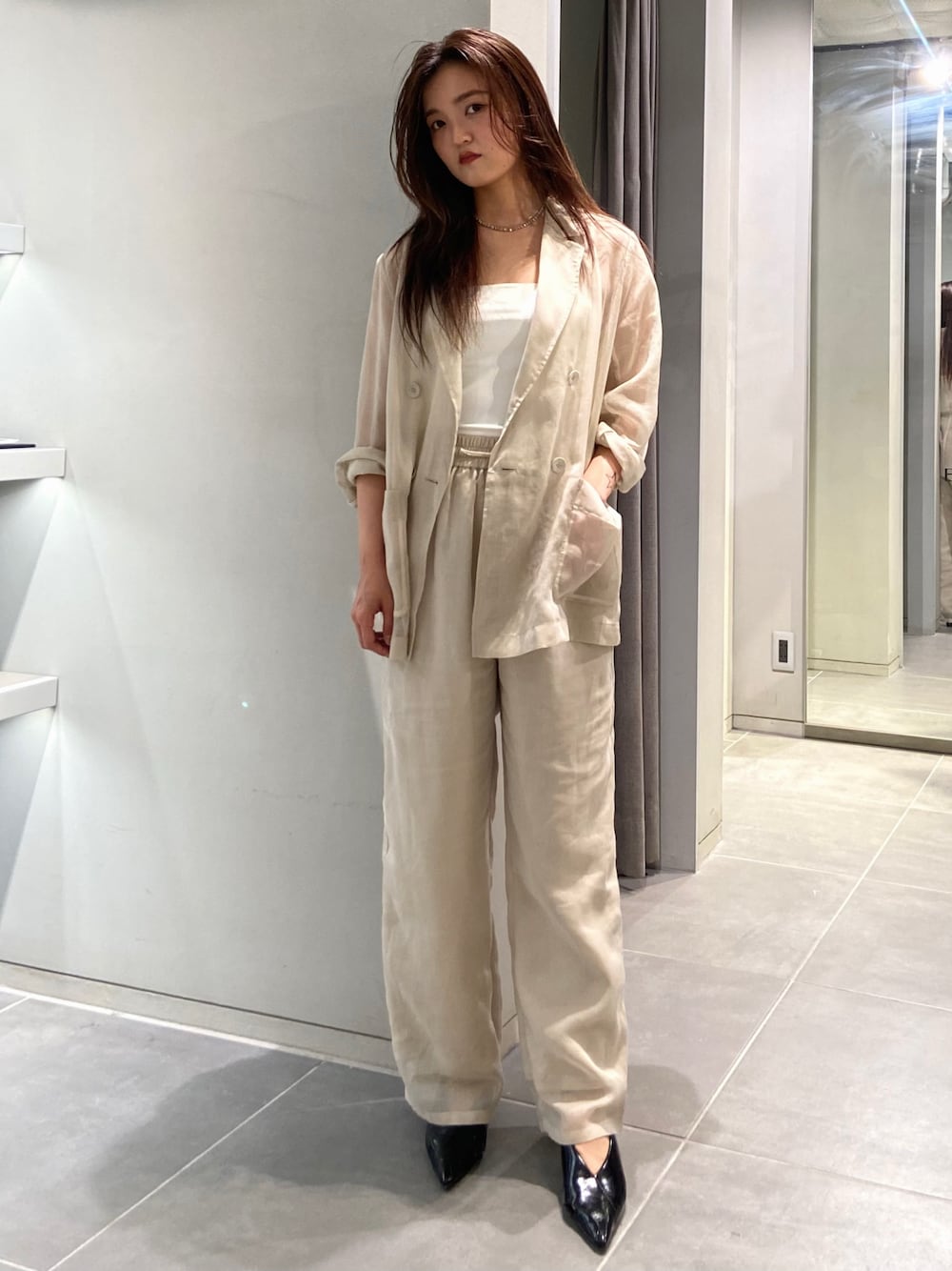 ジャケットセットアップ 【ジャケット】ほどよいシアー感できれいめにも着ていただけます。夏まで涼しく着用いただける素材感です。 【パンツ】ウエストが総ゴムなのでストレスフリーに着用でき、股上深めなのでシルエットも◯ 156cmで01サイズを着用。 【シューズ】 クッションがやわらかく、ヒールでも安定感があり歩きやすいです。22.5cmで37サイズを着用。