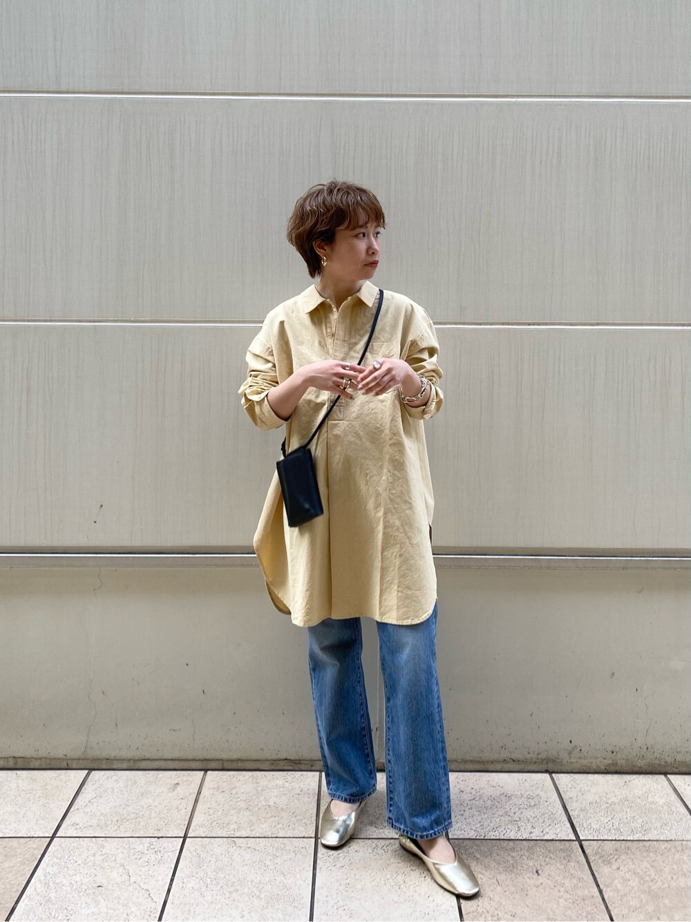毎年大人気のスキッパーシャツ!シャツは両サイドのスリットが深いので、ボトムス選ばす合わせやすく、小柄さんにもバランスの取りやすい着丈になっております。 履いているのは、イチオシのストレートデニムで足元にはゴールドのフラットシューズを。素肌を少し出すことで、抜け感が出て、こなれた雰囲気になります。 本日発売のショルダーbagはキャッシュレスな今の時代にぴったりなコンパクトサイズ!携帯とカード類だけ入れて、ちょっとそこまで♪な時にも便利ですよ。