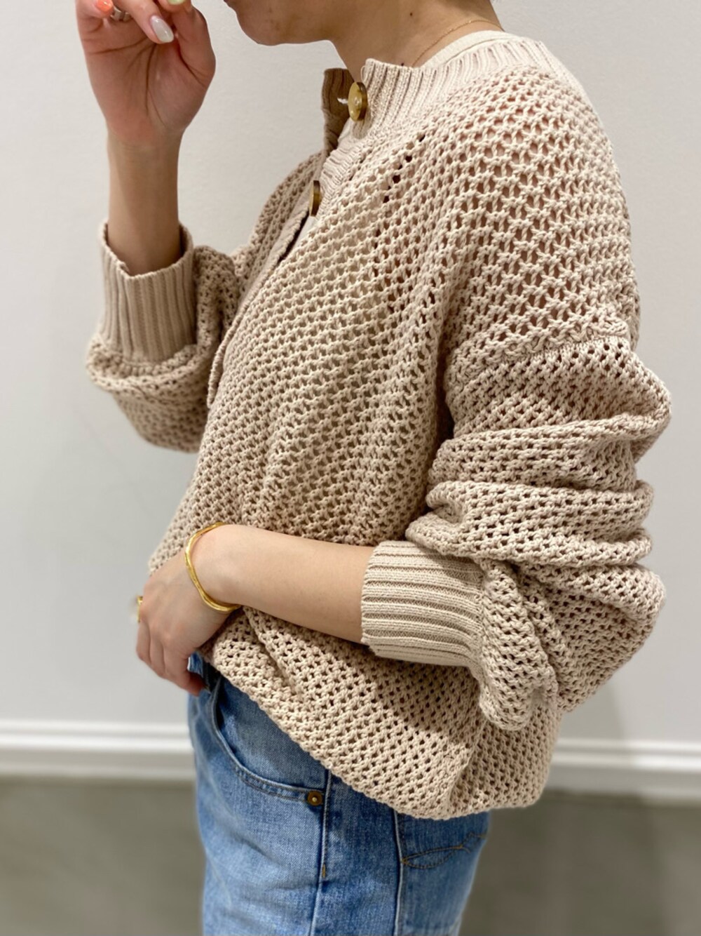 春コーデにぴったりな透かし編みニットが入荷しております。今時期だと、インナーにロンTeeを合わせレイヤードスタイルで。夏は華奢なキャミソールやタンクトップで、とことん素肌を透けさせるのも◎真夏は水着の上に着て海コーデにも可愛いですよ♡合わせているインナーは首回りも詰まりすぎず、リブ編みなので見えてもおしゃれな印象に。私はトップスがコンパクトなサイズ感だったので、バランスが取れるようにストレートデニムを選びました。太すぎず細すぎないシルエットなので、本当に何にでも合わせれるなと改めて実感♡迷った時はこのデニムがおすすめです◎
