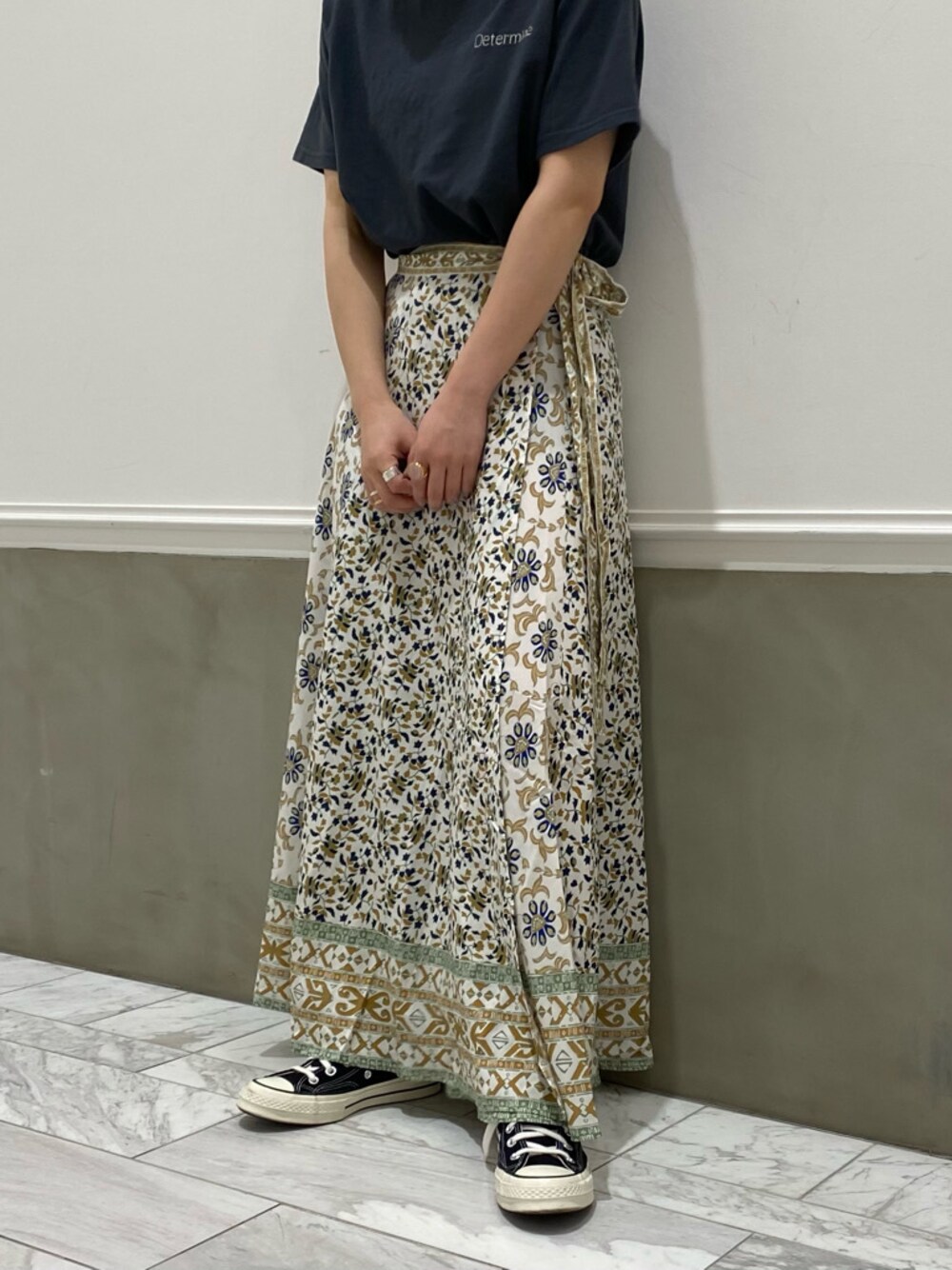 腰に巻きつけるだけの簡単ラップスカート☺︎ 着丈は151cmの私でもスニーカーで合わせれるので、身長問わず着て頂けます。ペイズリー柄がコーデの主役になること間違いなし◯ なのでTOPSはシンプルに。シンプルながら、刺繍デザインでバックスタイルが可愛い1枚で、スカートともバランスの取りやすいサイズ感です。スニーカーでカジュアルに合わせていますが、サンダルに変えると真夏スタイルも楽しめます☺︎