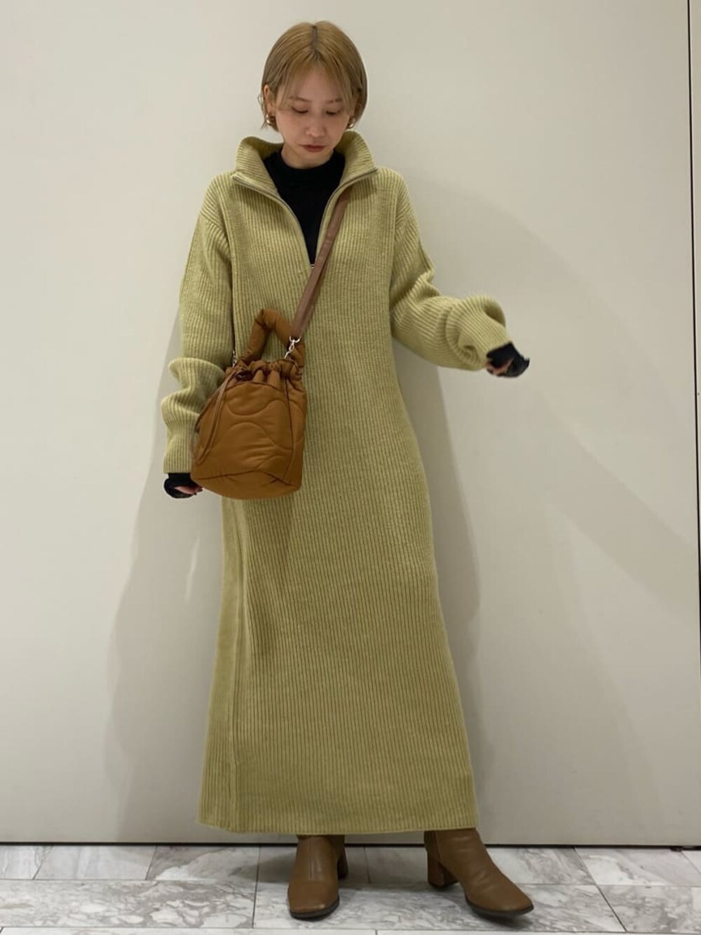 低身長さんにぴったりな着丈のワンピースが入荷しております。ジップ付きで、開けても閉じても可愛い。チクチク感もなく、着心地抜群◎ ロングコートを羽織って、大人っぽく合わせてみました。このコートは、151cmの私でもぴったりだったので、低身長さんにおすすめです!
