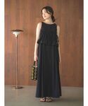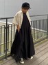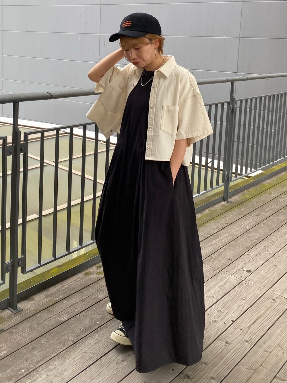 【マルチウェイタックワンピース着回し①】 ノースリーブ1枚が苦手な方には羽織アイテムをプラス。カジュアルなデニムシャツだったので、小物もキャップにしてみました。