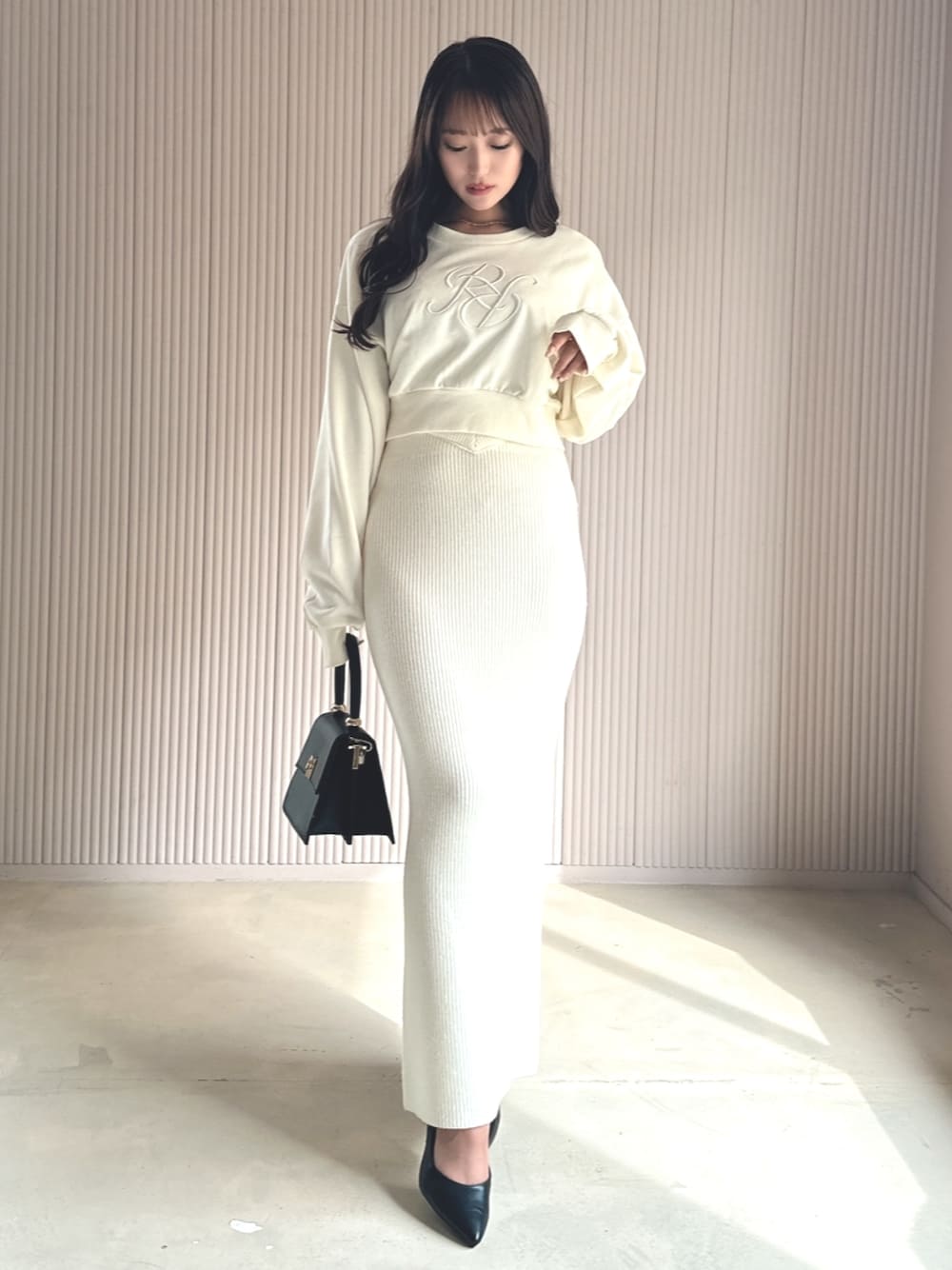ショート丈のスエット×タイトスカートでスタイルアップ効果◎スエットでもゆるすぎず、こなれ感を出せます♪
