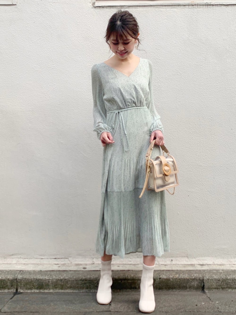 ストンと落ちる、程よい広がりのAラインワンピースです❤︎胸元はカシュクールになっており顔周りスッキリと見え、デコルテもキレイに見せてくれます☺︎細かいプリーツと緩いプリーツの交互になったデザインは立体感があり、1枚でも華やかさ◎!今の時期はインナーにタートルリブニットを入れたり、ビックシルエットのニットやパーカーを合わせて2ピースコーデにしてもいいので、着回しもできちゃうワンピースです♩