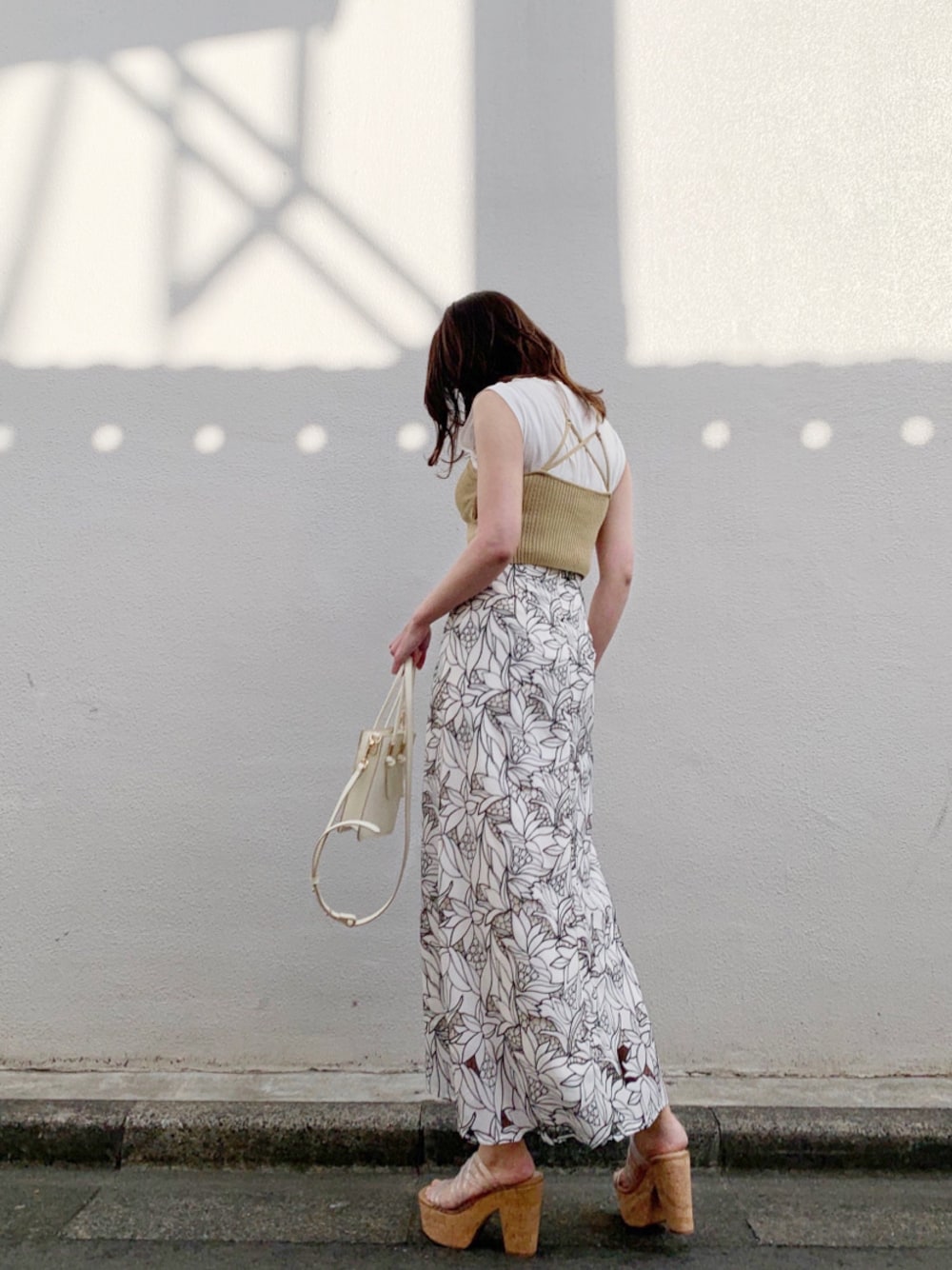 立体感のあるカットワーク刺繍スカートと差し色のイエローが映える春先取りコーデです❤︎ニットはビスチェとノースリカットソーがセットになったアイテムで、ビスチェはカップ付き(取り外し可能です!)なのでビスチェのみ着用して、ジャケットを合わせるコーデなどでき、お洒落マストアイテムです☺︎ビスチェニットは生地は厚めで、タオル生地に近い素材なので春から夏までしっかり着用して頂けます♩バストが気になる方はカップ取り外して頂くとボリューム感が抑えれます★肩紐もアジャスター付きです(^_^)スカートはMERCURYDUOオリジナル刺繍が施されている存在感たっぷりのスカートです!生地はさらっと真夏でも履きやすい素材です☺︎ナローシルエットという、ウエストのラインがキレイに見えるシルエットなので、トップスをインするとより縦のラインが綺麗に見えます❤︎春先はカラーニットやブラウスで女子会などに◎、夏はTシャツ合わせてデイリー使いもおすすめです(^∇^)コンパクトなニットに細身のラインスカートを合わせているので、足元に厚底ソールのサンダルを合わせてバランスを取ると脚長効果もより◎、スタイルアップできます♩トレンドのクリアなサンダルはコーデに抜け感が生まれます☺︎今回はキレイめバッグを合わせて大人女子に❤︎夏らしいカゴバックなど季節感ある小物を合わせるのもおすすめです♪