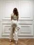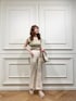 今年も出ました!毎年大人気のラッフルニット❤︎どんなお洋服にも合わせれて、シンプルすぎないデザインが他のニットと差を出せる優秀アイテムです☺︎かなりコンパクトに見えますが着心地は締め付けもなくサラッと着れます!袖のラッフルデザインは肩幅が広く見えず、肩の山が隠れる袖丈なので二の腕が気になる方や肩幅が気になる方にも着やすいです◎!前後2WAYのスクエアネックとVネックお好きな方で着て頂けるので、羽織りやボトムス、その日の気分で雰囲気変えて頂けます(^∇^)背中の開き具合も下着が見ない位置なのでデイリー使いも◎!着丈が短めなのでハイウエストのボトムス合わせてウエストの位置を高く見せれるので、スッキリとしたラインのコーデが組めます❤︎今回は少しボリュームのあるフレアパンツを合わせて大人フェミニンに☺︎生地はリネンのようなドライタッチな素材ですが、シワになりにくい合繊素材を使用しているためデスクワークや長時間の移動、旅行にもオススメです◎!華奢なベルトがアクセントになるのでシンプルなコーデにもメリハリが生まれます♩全体的にコンパクトなシルエットにまとめたので、足元と鞄はボリューム感をプラス!サンダルは厚底だけどワントーンカラーで全体のカラーをまとめてくれます❤︎カラートップスやボトムスを着ているときにオススメです♪鞄はかなりボリュームがありますがクリア素材になっているので存在感抑えめにコーデに抜け感を演出してくれます(^∇^)