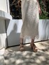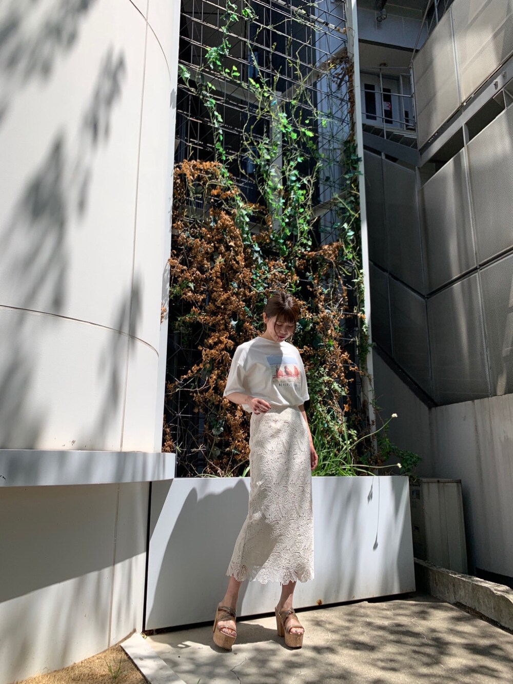 Tシャツ×レースタイトスカートで大人カジュアルコーデ!Tシャツ=カジュアルなイメージを持っている方が多いと思いますが、普段きれいめなコーデが多い方でもすぐに取り入れやすいスタイリングです◎Tシャツはあえてビックシルエットのデザインを選んで、スカートのタイトなシルエットをより強調して頂けるとスタイルアップになりますよ❤︎スカートは後ろに深めのスリットが入っているので動きやすさも◎裾のカッティングが花びらの形になっているのがMRECURYDUOのこだわりポイント!レーススカートをいくつかお持ちの方にも、ぜひ履いて頂きたい大人可愛いレーススカートです♪