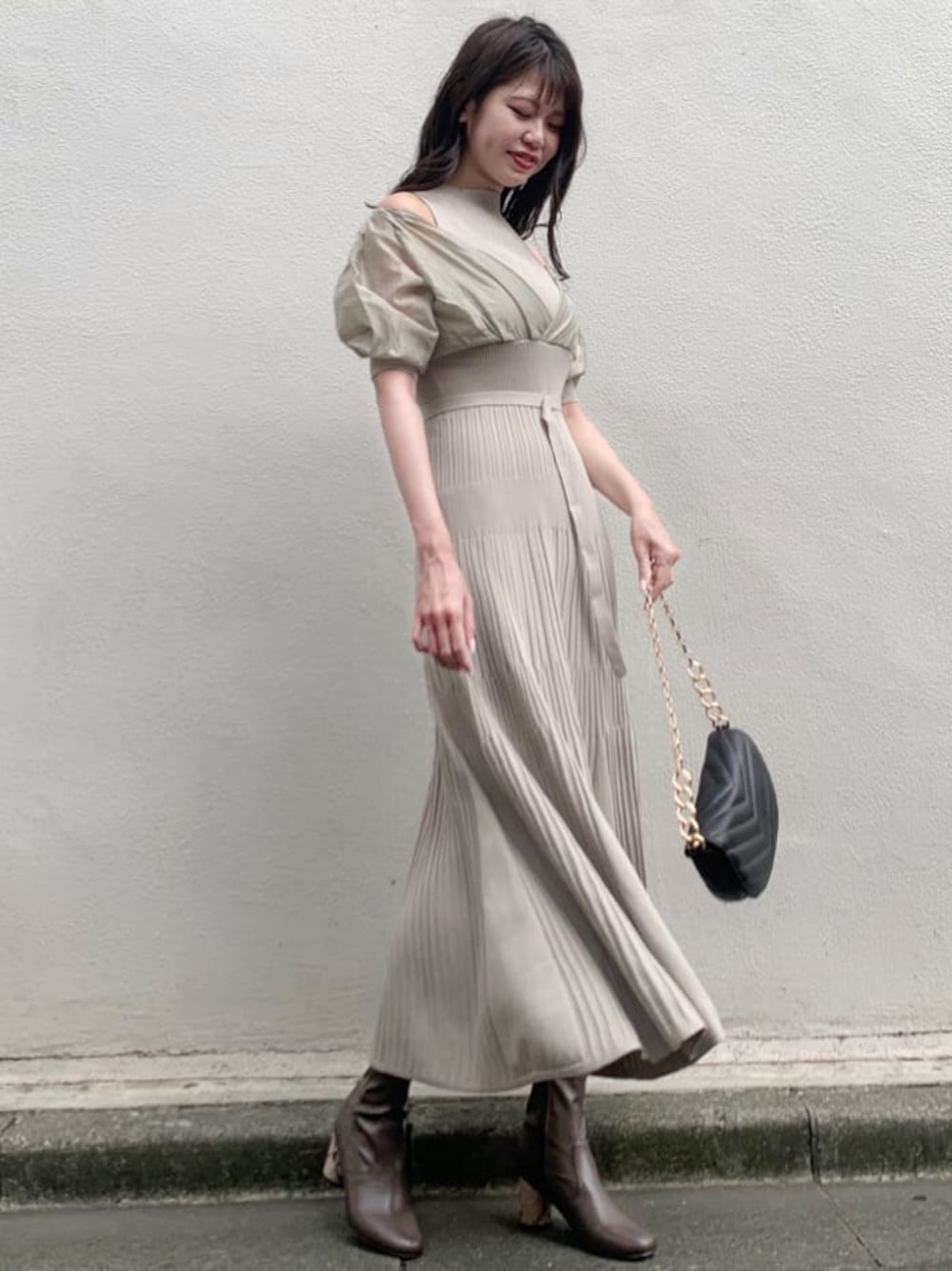 浅川晴香のワンピース「異素材ドッキングフレアニットワンピース」を使ったコーディネート