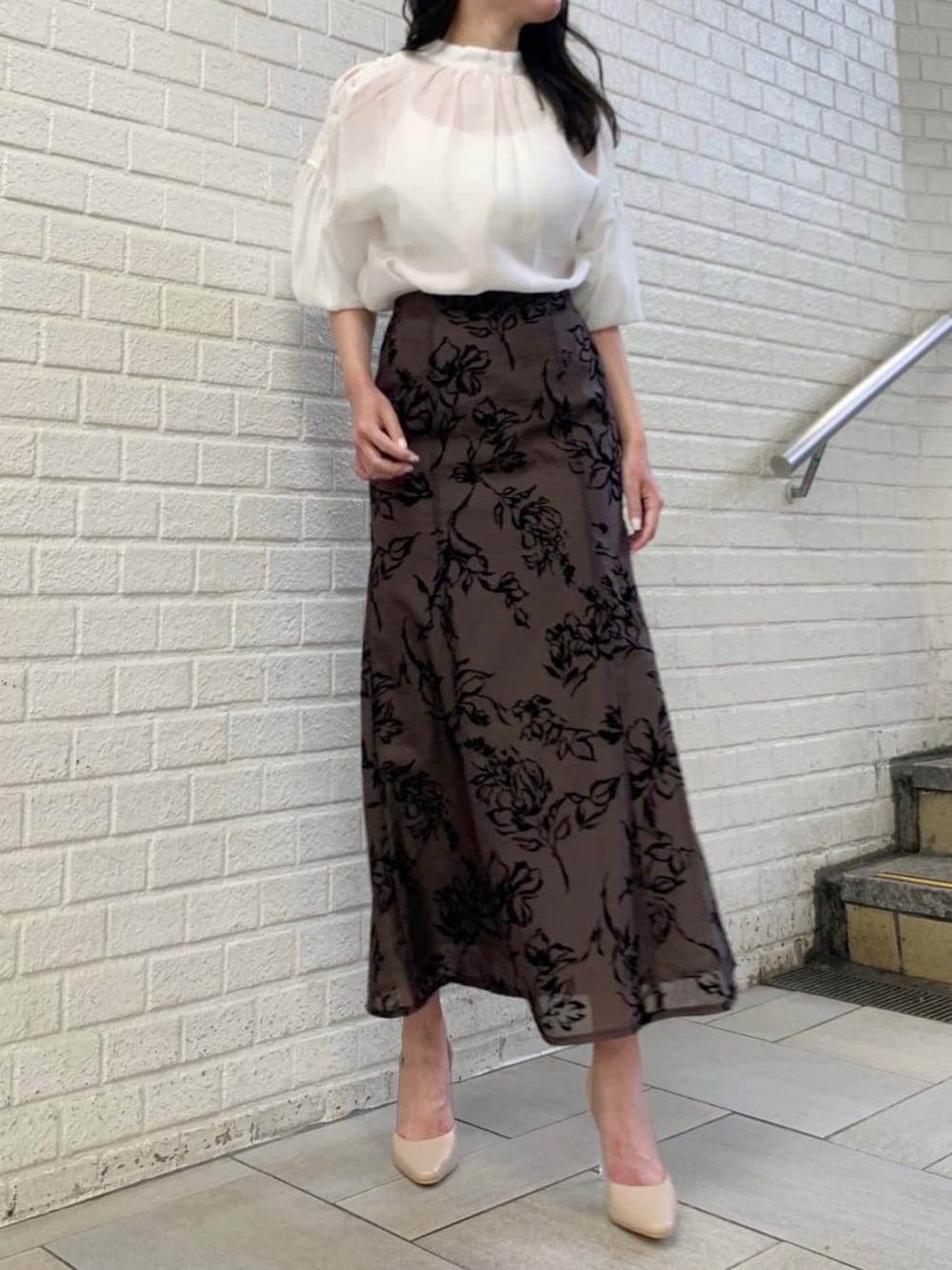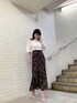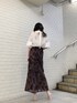 オフィス・デート・女子会、、、どのシーンでもおすすめのコーディネート❤︎ブラウスは袖にボタンがついていて、お好みの開き具合に調整できるので、オフィスではカチッと!OFFの日には方の肌見せをチラッと!雰囲気を変えてくれるブラウスです♪柔らかい生地なのでインスタイルも綺麗にできます!後ろのリボンもワンポイントで可愛いですよね❤︎ 袖にはゴムが入っているので、手首が見える位置まで捲り上げて頂き、バルーンスリーブにすると手首がより華奢見えして女性らしいラインが出ます♩シンプルなブラウスに合わせた大人スカートは、フロッキープリントといって少し立体感のあるプリントを施しているため、高見え効果抜群です!生地はリネンのような軽い素材なのでデイリー使いもしやすいです❤︎少し腰のラインが出るセミAラインのシルエットでタイトスカートが苦手な方にも取り入れやすいです!足元をパンプス合わせで綺麗めにしても◯、ブーツを合わせて秋っぽくしても◯、あえてスニーカーでカジュアルダウンするのも◯!お好みのテイストに仕上がる優秀スカートは1枚あるとかなり重宝します❤︎