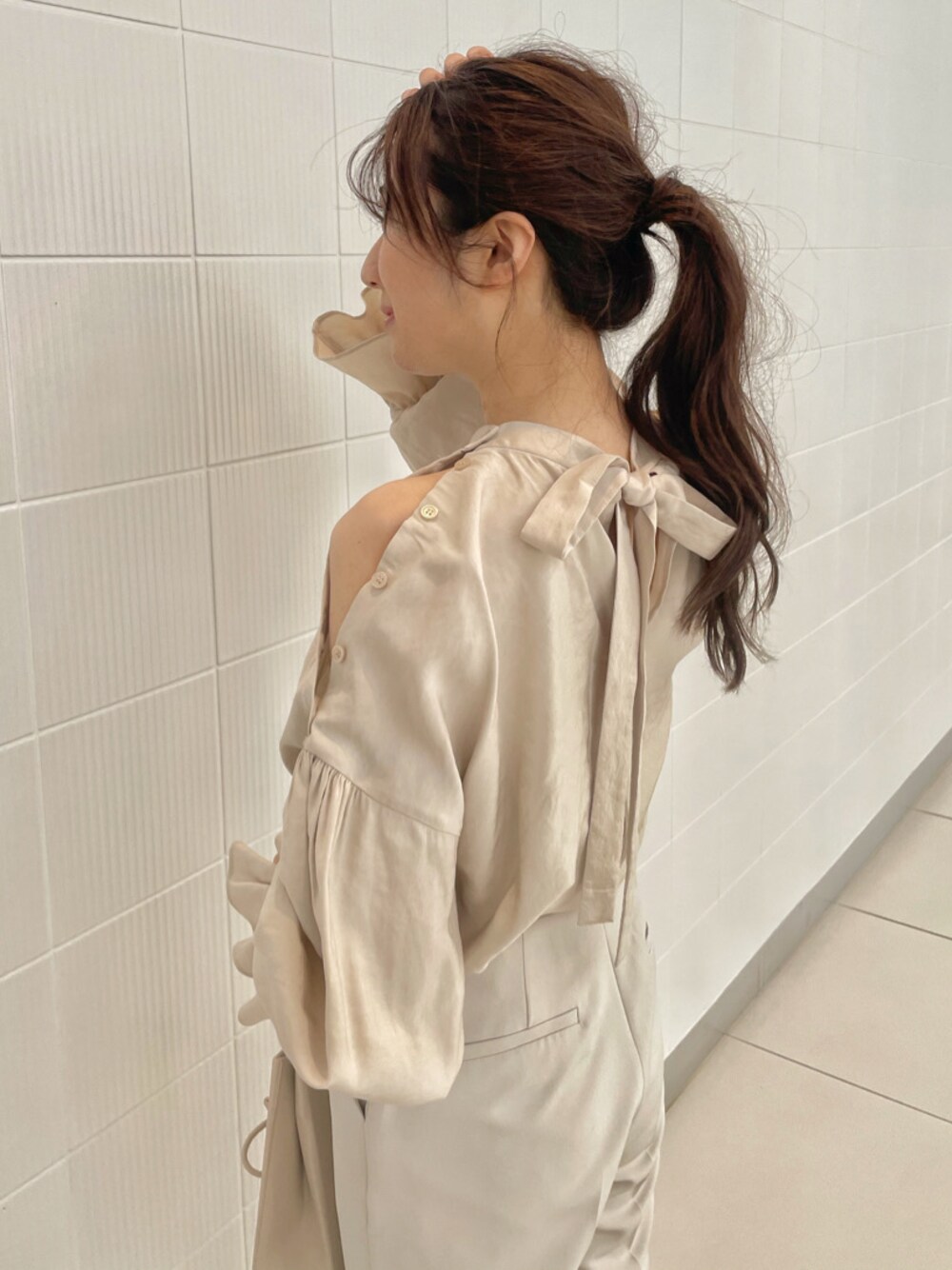 トップスは肌見せ、バックリボン、袖のくしゅっと感、細かいデザインがあざと可愛いブラウスです♡ 肩見せや首元のタックですっきりした印象になるので、ハイネックや首詰まりが苦手な方でも挑戦して頂きやすいと思います◡̈⃝ 肩のボタンは開閉可能なので、コーデによって雰囲気も変えて頂けます❤︎ ボトムはオールシーズン使って頂けるパンツで、ニットとの相性も◎ あえてカットソーやスニーカー合わせでカジュアルダウンして着ても可愛いです♫ センタープレスで脚長効果も抜群です! バッグはショルダーも付いており、小さいバッグも取り外し可能です♡ 今年トレンドのデザインなので持つだけで一気にコーデがお洒落見えします♪ 全体的に淡い色合いだったので、バッグにスカーフを巻いて合わせました! 首に巻いたり、ヘアアレンジの1つで使って頂いたり、色んなシーンで使って頂けるので、1枚あるとお洒落の幅が広がるアイテムです♡
