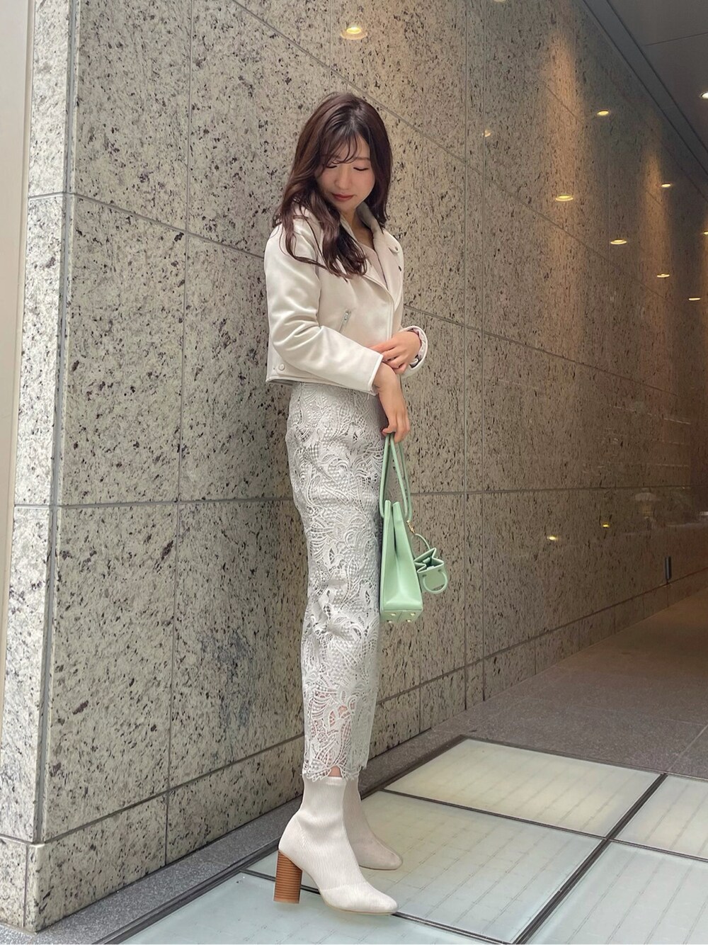 トップスはシフォン袖×透け感×アシメネックが可愛いニット❤︎ デコルテ見せで女性らしい印象にもしてくれます◡̈⃝ スカートはマーキュリー定番のレースタイトスカートです♡ ハイウエストなので脚長に、またウエストもくびれて見えるデザインで履くだけで細見えします! 裾に透け感もあるので小柄な方でも着て頂きやすいです❤︎ 合わせたライダースもマーキュリー定番アウター♫ ショート丈で羽織ると腰の位置を高見えさせてくれます!ライダースですがスエード生地と淡いカラーで、ハードにならず優しい印象に♡ バッグはトレンドのショッパーデザインバック! 一気にコーデをお洒落な雰囲気にしてくれます♪