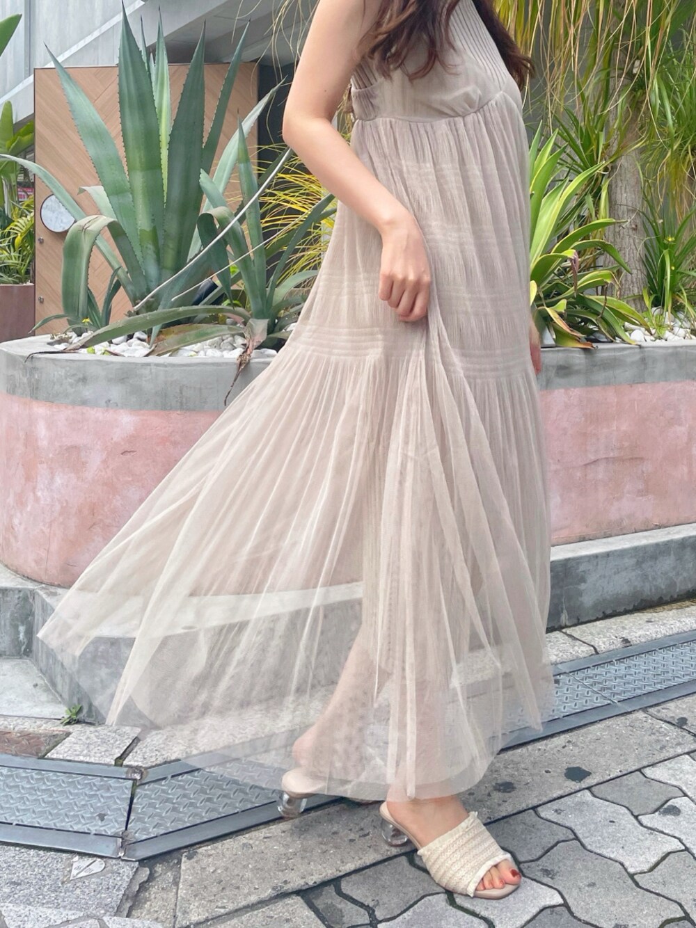 マーキュリー定番ワンピがNEWデザインになり気になっていたので着てみました♡ マジョリカプリーツが少しフェミニンさを抑えているので、子どもっぽくならず大人フェミニンな印象で着て頂けます♫ セットはもちろん別々でも使えるので着回し抜群アイテムです◡̈⃝ レーヨン素材のさらっとしているサマーニットなので、夏場でも涼しく着て頂けます♡ チュールワンピの長さは後ろの紐で調節が可能なので、コーデの雰囲気や背丈に合わせて変えて頂けます♪ 中のニットワンピは若干短めなので、小柄な方も着て頂きやすく感じました。よりナチュラルな印象にしたかったので、シューズはペーパー素材とフリンジがポイントのサンダルを合わせました◎ ヒールがクリア+フラットではなく高さもあるので、カジュアルになりすぎない印象に! 合わせるだけで春夏っぽいお洒落なコーデに仕上げてくれます♡ 合わせたアクセは揺れ感とフラワーデザインが可愛いアイテム! カラーもゴールドなので1年中お使い頂けます♡