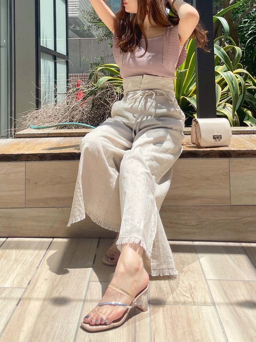 【ベージュの大人フェミニンcode♡】トップスは定番の大人気ニット!袖のフリルが二の腕を華奢に見せてくれます。脇までしっかり隠してくれるので、インナー気にせず着用頂けます◎ ピンク系のベージュで甘めなので、ボトムはパンツ合わせで大人っぽくまとめました。歩くと裾のスリットから足が見えて女性らしい印象に♡ Tシャツやブラウスと合わせても可愛いです◡̈⃝ リネンパンツは夏の定番ボトムなので、1着あると便利に着回しして頂けます♫