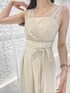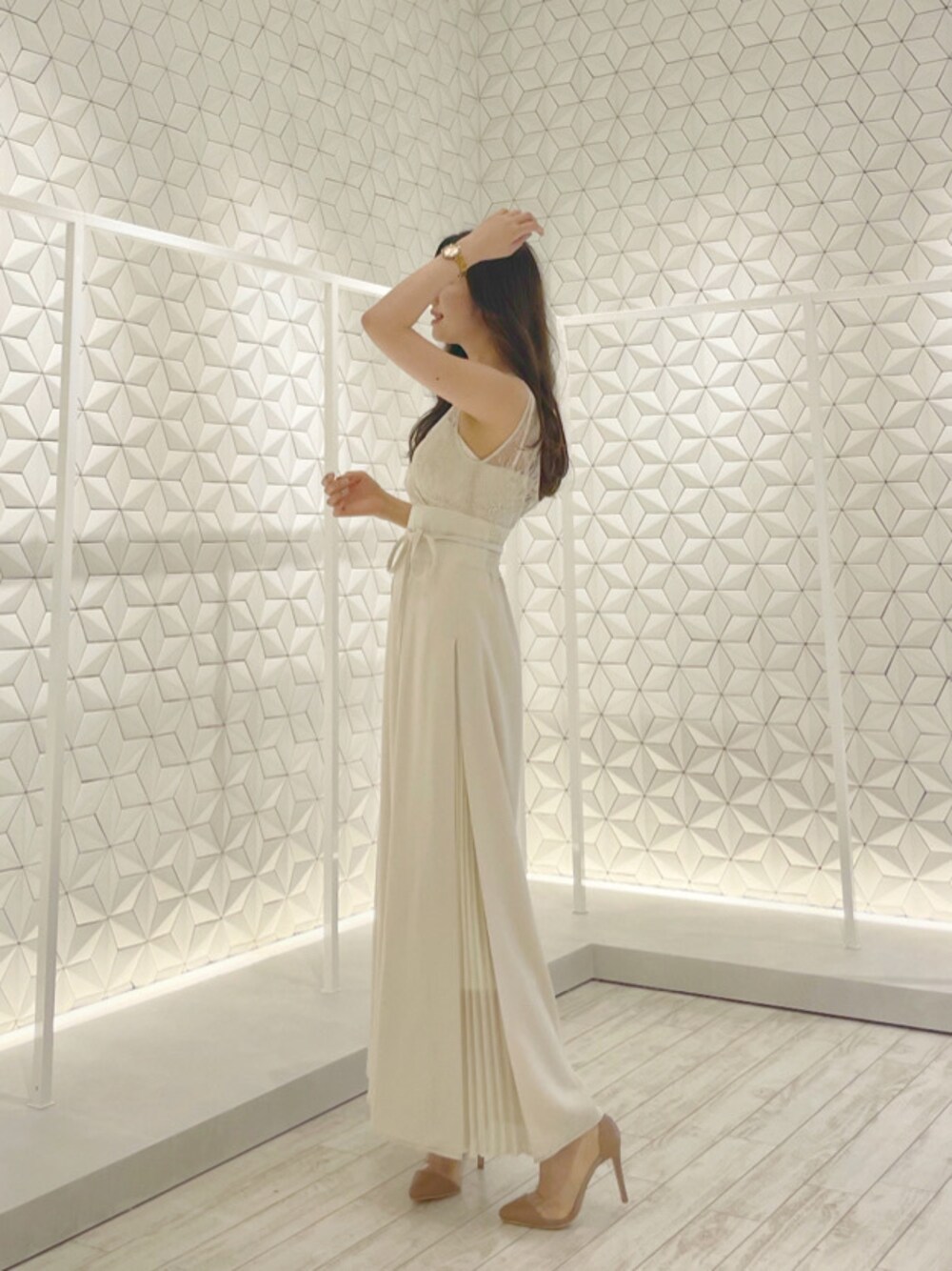 【MERCURYならではの上品ロンパース♡】胸元のレース、サイドのプリーツがMERCURYならではのデザイン!ハイウエストで脚長効果も抜群!太めのウエスト切替がよりお腹周りを細く見せてくれます。動く度に広がるボトムのプリーツが華やかな印象に♡ とろみのある生地感のため歩いた時の揺れ感が上品で、女性らしさをより引き立たせてくれるアイテムです。