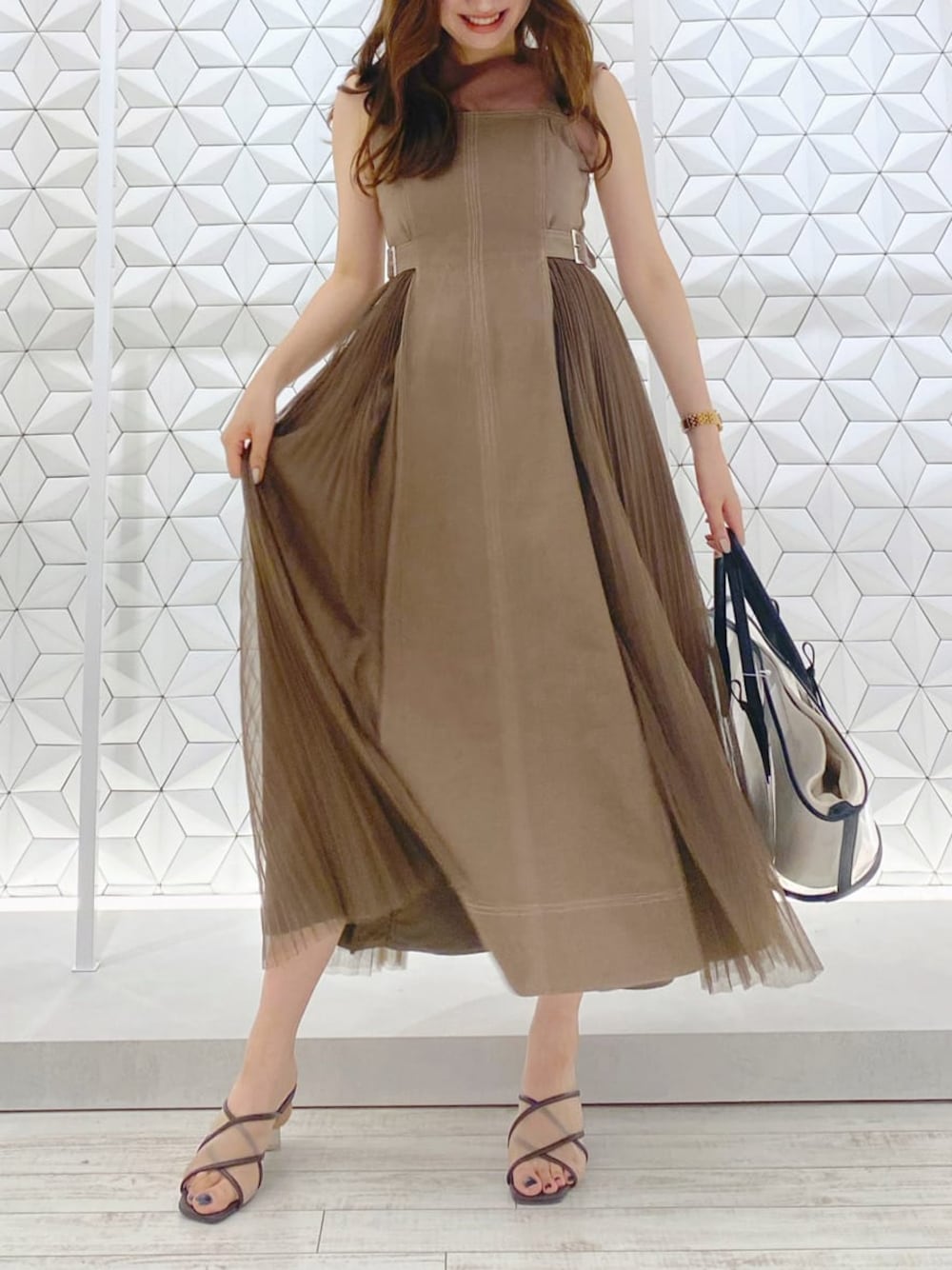 【大人かわいいブラウンcode♡】大人気ジャンスカが再入荷したので、もう一度着用しました!トップ部分はコンパクト、ボトムはボリュームのあるシルエットの為上下でメリハリのある印象に。ふわっと広がるチュールが女性らしく上品見えします♡ インナーはブラウスやTシャツでカジュアルダウンしても◎ 秋冬に長袖ニットにブーツでも可愛いので、年中着回しして頂けます。もちろん1枚で着ても◎ 今回はセンシュアルニットジャンスカドレスのシアーニットを合わせました。 合わせたサンダルはシアーがトレンドライクなアイテム!積木のようはヒールがお気に入りです♡ コーデをぐっとお洒落に見せてくれます。