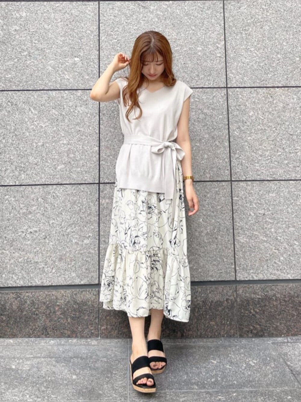 【着回し抜群セットアイテム♡】店頭でも大人気のニット×スカートセットアイテムを着用しました! フレンチスリーブなので1枚で着やすく腕もすらっと細く見えます。二の腕を出すのが苦手な方でも、試着すると意外と大丈夫でした!と店頭でもよくお声を頂けます♡ 白ニットでありがちな透け感は無いので、インナー気にせず着れるのもおすすめポイント。スカートは前後差があり足首が見えるためすっきりした印象に。長ければウエストで折って頂くのも◎ ウエストは総ゴムなので着心地も楽ちんです♡ トップスは下にパンツを合わせたり、インしてキレイめスカートに合わせるのもおすすめです! スリット入りなのでフロントだけ入れ込むのも◎ スカートはトップス選ばす万能に着回せるので、1着でコーデの幅を広げて頂けるアイテムです◡̈⃝