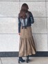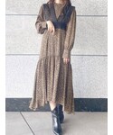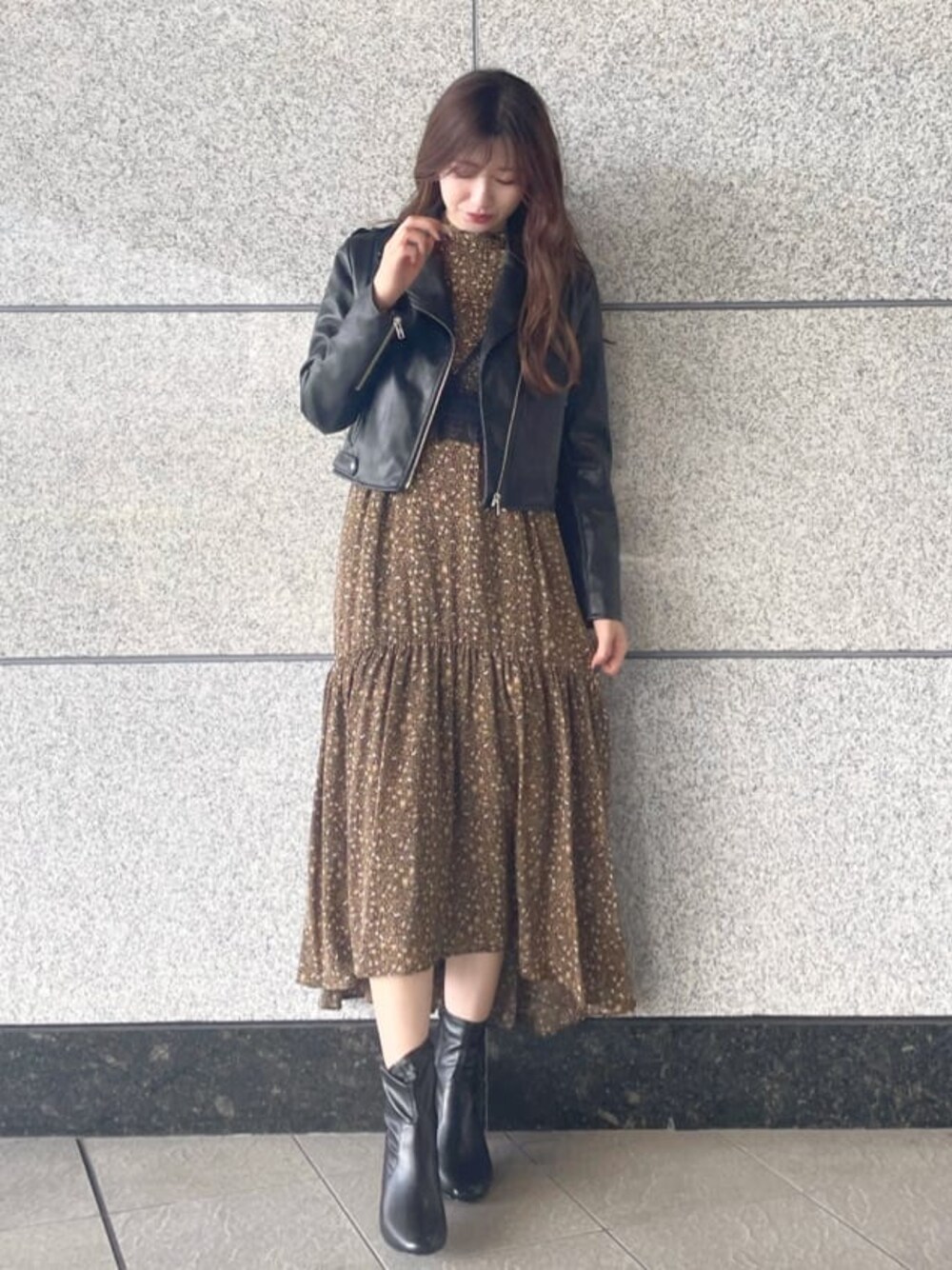 【女子会にもおすすめ♡フラワーワンピコーデ】ワンピースは何とレースビスチェとのセットアイテム。このビスチェを付けると腰の位置を一気に高見えさせてくれるので、簡単にスタイルアップが叶います。レースなので柄や無地問わず着回し抜群。また、合わせるだけでコーデをワンランクお洒落に、華やかにしてくれます♡ ブラウスや別ワンピに合わせたり、ニットに重ねても◎ ワンピースは広がりがキレイなシルエットに惹かれました♡ 少しとろみのある生地感で、透けはありません。ハイネックできちんと感を出してくれつつ、たぷんとした袖やバックシャンで抜け感を出してくれています。袖は少し長めで袖口はきゅっと若干タイトめ。後ろは丁度インナーが見えない高さです。背中空きが気になる方は、あえて見えても良いインナーを入れるのも◎ その場合はビスチェと揃えてブラックやレースのインナーがおすすめ♡ 合わせたライダースはマーキュリーデュオの大人気アウター。ショート丈でサイズ感もコンパクトなので、ワンピースにもバランス良く合わせやすいです。軽くて柔らかいので、羽織った時の着心地の良さもポイント。レザー特有の厳つさがなく、キレイめにお使い頂けるおすすめのジャケットです♡