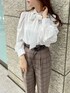 【秋のクラシカルコーデ♡】トップスは前後2wayで着用できるブラウス。肩にタックが入っていてパワショルのシルエットになっています。袖は少しゆったりしていますが、袖口のボタンでかちっとした印象になります。袖口のデザインもお気に入りポイント♡ ホワイトは透け感があるので、インナーはマーキュリーデュオ定番のレースベアトップを入れました。夏の終わり〜秋始めの気温差があるこの時期は、ブラウスだとアウターで調整しやすいので、この時期は特におすすめ♡ ボトムがパンツなので、甘さを出すためリボンを前に着用しました。テーパードのキレイなシルエットと、少し珍しいベルトのデザインがポイントです。ハイウエストで切替も太めなのでスタイルアップ効果◎ ベルトループがないデザインです。テーパード太ももやヒップの形をあまり拾わないので、気になる方へもおすすめです。