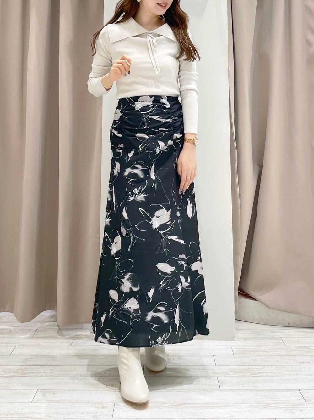 【トレンド×大人かわいいスタイリング♡】トップスはトレンドのセーラーカラー♡ 前後2way+オフショルでも着れるので、1着で色々な着こなしをして頂けます。リブは伸縮性があるので着心地も抜群。オフショルにした際も動きにくさや、ずり落ちてくる感じもありません!生地もしっかりしているのでインナーの透けもなく着れます。ほどよく身体に沿うサイズ感なので、腕やお腹等ラインが出過ぎることもありませんでした ◡̈⃝ 袖は少し長めのデザイン。ホワイトは少しだけグレー味がかったような、上品なカラーに感じました。スカートはアートプリントとギャザーが印象的なデザイン♡ 身体に自然に沿う形で、タイトでもフレアでもありません ◡̈⃝ 少し光沢感があるのも上品な印象になります。 トップスはブラウスやTシャツ、ニットと合わせても◎なので、季節問わずお使い頂けます♡