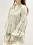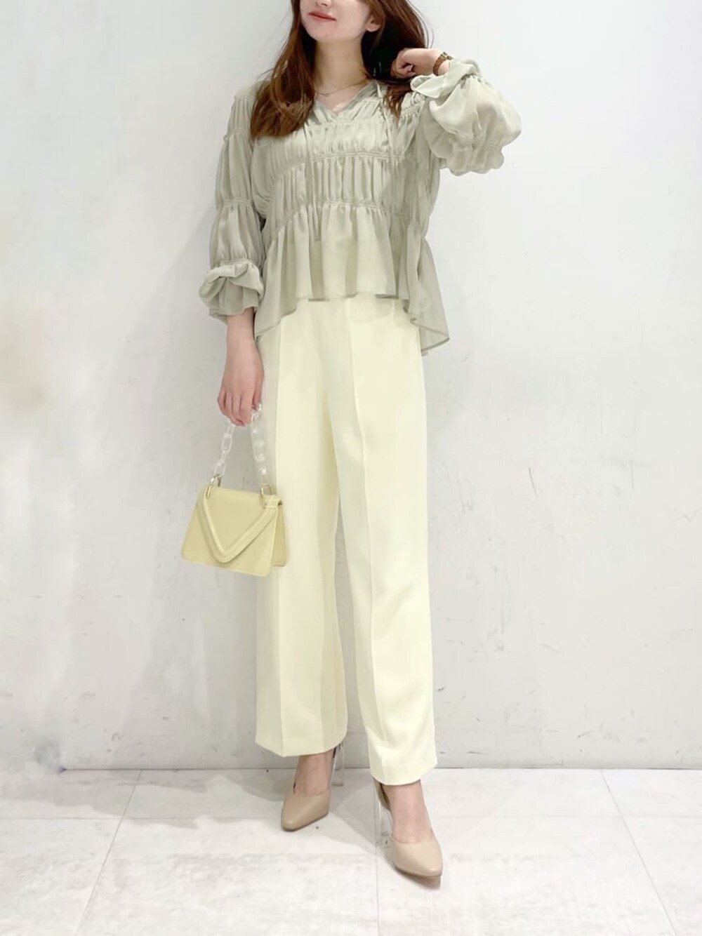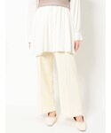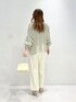トップスは袖をたくしあげた時のくしゅっと感も可愛くておすすめ◎ 腕を動かした時のシルエットや透け感も上品です ◡̈⃝♡ シルエットがふわっとなっているので、ボトムはパンツか、スカートはタイト系のものを合わせるとバランスが取りやすいです♫ パンツはさらっとした生地感でボディラインを拾わないシルエット。スッキリ着たい方はトップスインもおすすめです♡