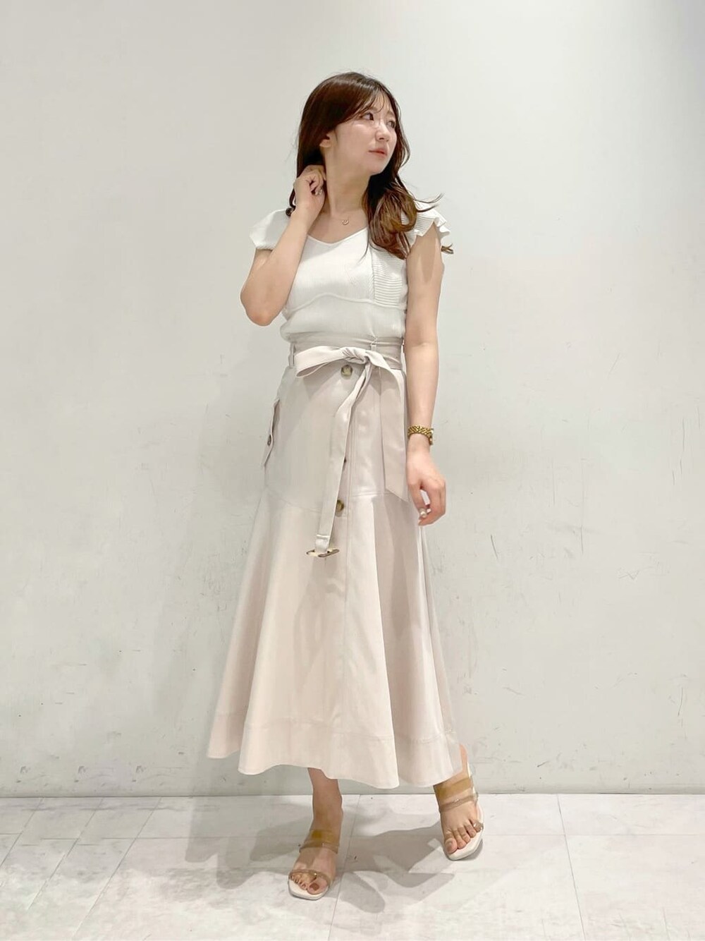 大人フェミニン淡色コーデ♡【トップス】毎年大人気の定番ニット◡̈⃝ ビスチェ風のデザインが腰の位置を高見えさせてくれます♡ ラッフル袖が二の腕カバーにも◎ アウトしてもバランスの取りやすい丈感です。【スカート】さらっとした生地感で春夏にぴったり♡ ベルトは長めなので、結んで頂くのがおすすめです◡̈⃝ ブラウス合わせでキレイめコーデや、Tシャツにスニーカー合わせも◎♡ 【シューズ】底は薄めに見えますが、クッションがしっかり入っているので履き心地抜群!華奢なデザインなので、コーデを一気に女性らしく、また抜け感を出してくれます♡ 足の甲部分のサイズ感は、いつもより少しゆとりがあるように感じました。