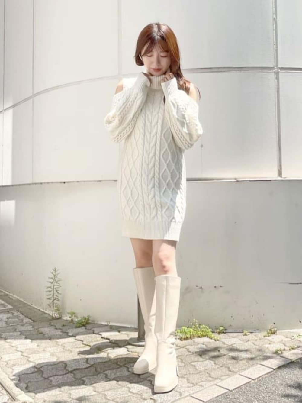 ちらっと見える肌見せ、袖のゆるっとしたサイズ感、ミニ丈等あざと可愛い要素を詰め込んだモテワンピース♡ 足元のブーツはクッションがしっかり入っており、疲れ知らずの楽ちんシューズ!アイボリーカラーがよりフェミニンな印象に♡