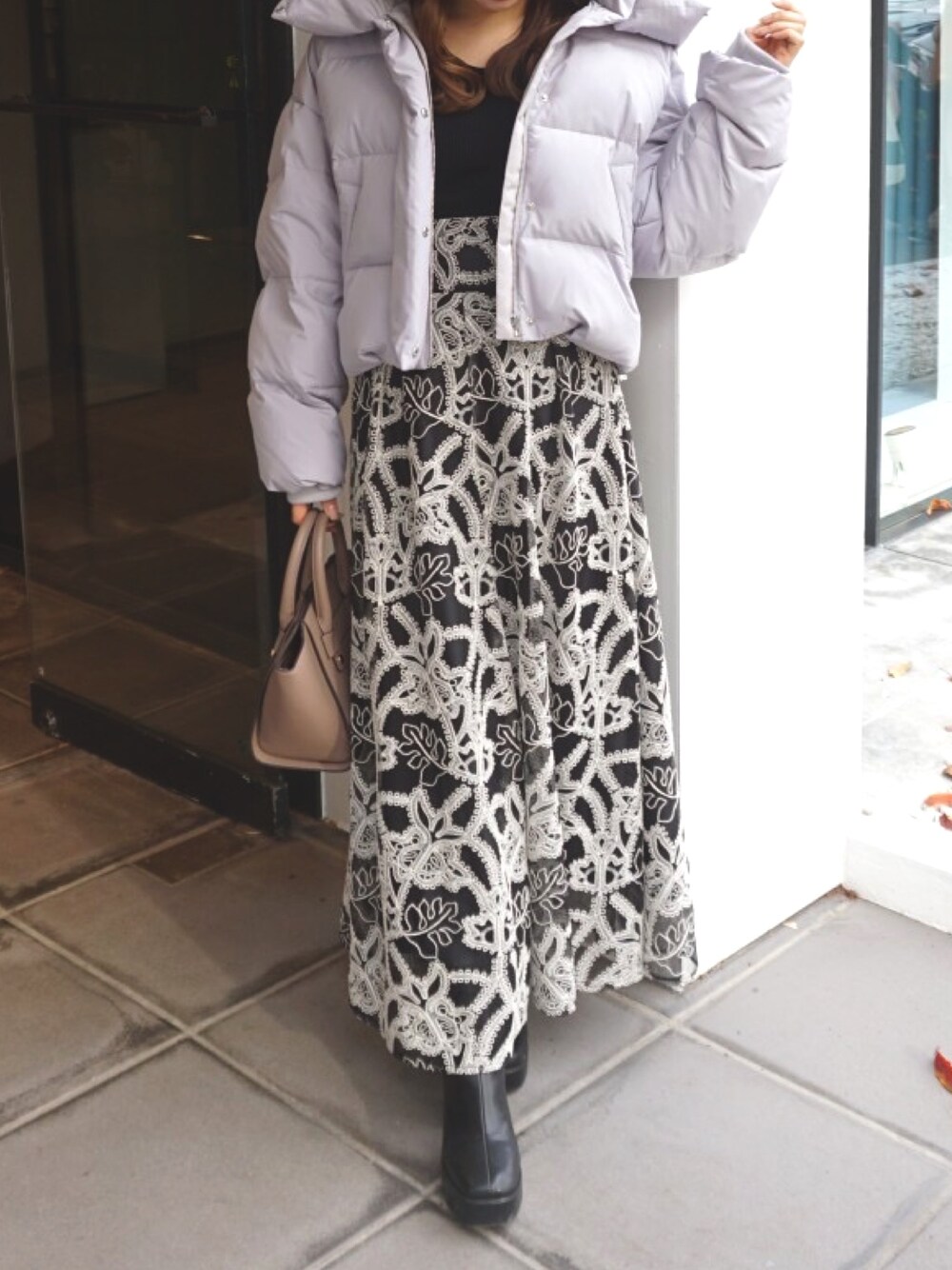 アウターは毎年大人気なダウンコート◎ 今年はスタンドカラーにもなる トレンド感たっぷりのデザイン♡ ウォッシャブルなのもポイント! ころんとしたショート丈のシルエットが 女性らしい印象に♡ スカートは刺繍が華やかなアイテム! フレアのシルエットなのでトップスは コンパクトなものがおすすめです♫