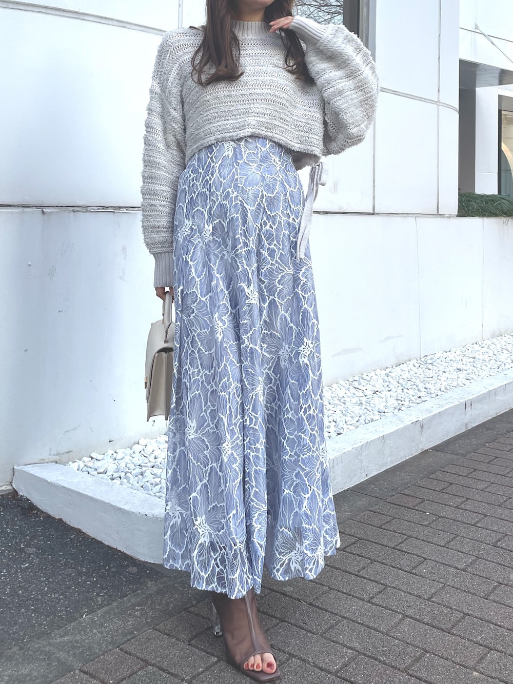 #mm泉里香さん着用コーデ。 ゆるっとしたシルエットが可愛いニットは ショート丈なので脚長効果抜群! ハイウエストボトムと合わせたり、 ワンピースにレイヤードして着用するのも◎ スカートはレースが華やかで春らしさを出してくれるアイテム。 ハイウエスト切替なのでスタイルアップ効果も!