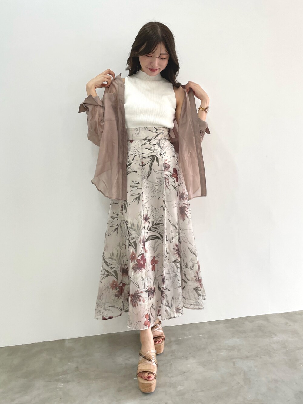 少し光沢があるマーキュリーのシアーシャツは、カジュアルになりすぎず女性らしさを残してくれるアイテム。肌の透け感も上品見えします。キレイめやフェミニンなアイテムとも相性抜群!花柄スカートと合わせて大人可愛いコーデにしました。