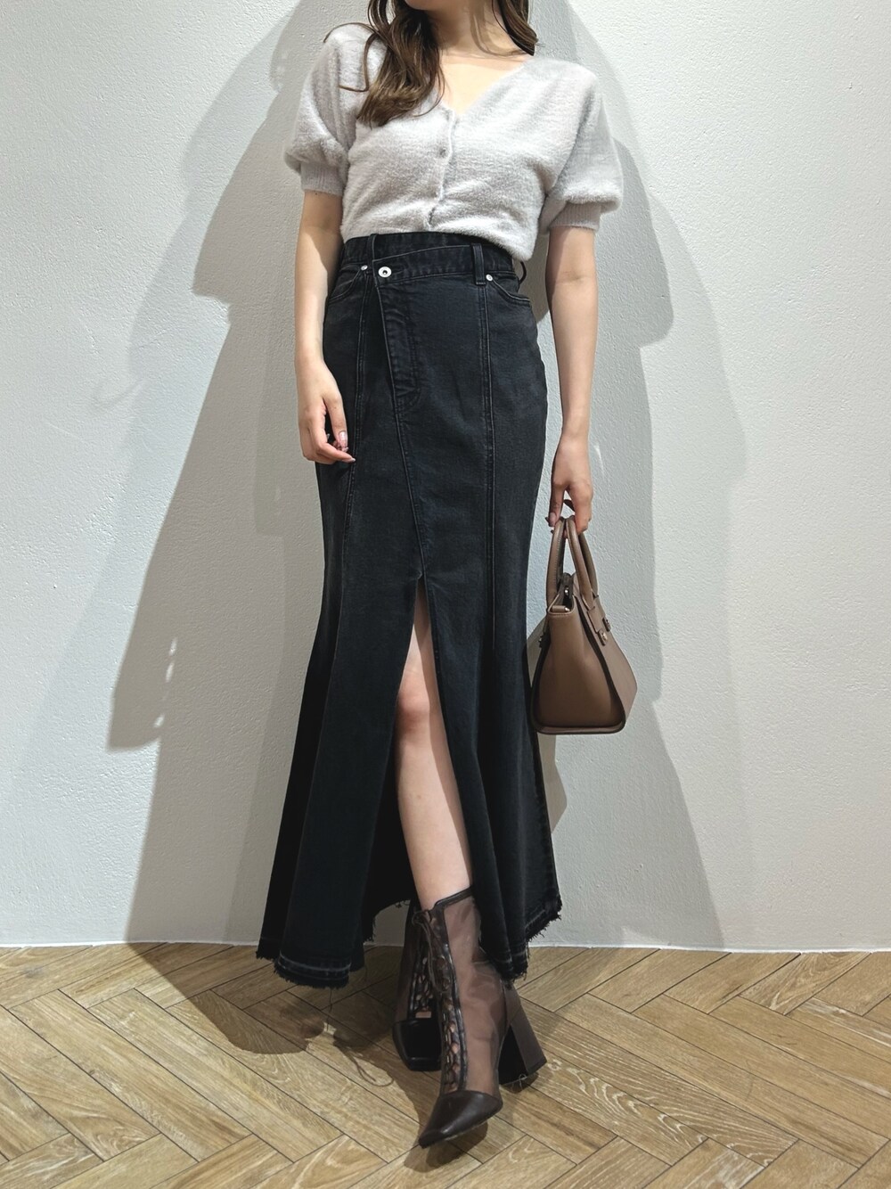 トップスはマーキュリー定番のシャギーシリーズ!ふんわりした袖の形が二の腕カバー&フェミニンな印象に。ショート丈なのでボトムにアウトして着ても◎ スカートはカジュアルすきず、女性らしい印象になるデニムスカートを合わせました!