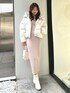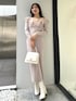 異素材のラッフルが顔周りを華やかに見せてくれるので、アクセサリー無しでも◎ 切替位置が高いので脚長効果も抜群です。