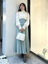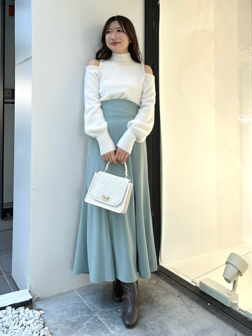 トップスはマーキュリーの定番シャギーニット!ふわふわ素材からの肩出しであざとく可愛い印象に。インナーの透けもなく着用いただけます。コルセットのようにきゅっと細見えさせてくれるマーメイドスカートは、トップス選ばす着回し抜群。1着あると大活躍します。