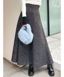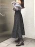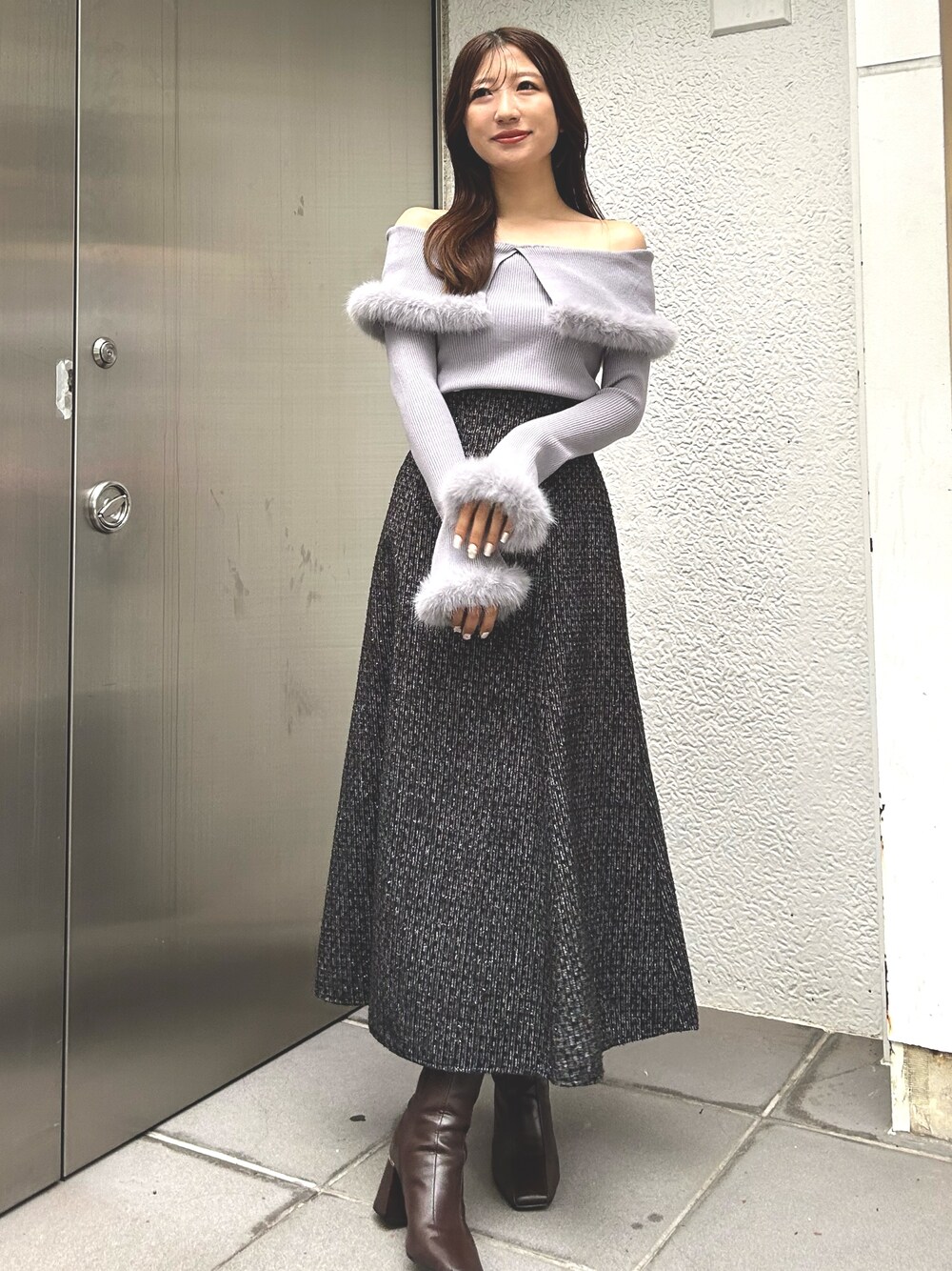 ふわふわファーが華やかで、オフショルとの対比であざと可愛いデザイン。柔らかい生地感なのでオフショルが落ちたり上がったりもしません。少し厚手のツイードスカートは秋冬らしさを高めてくれるアイテム。レースアップで腰回りはスッキリ着用できます。