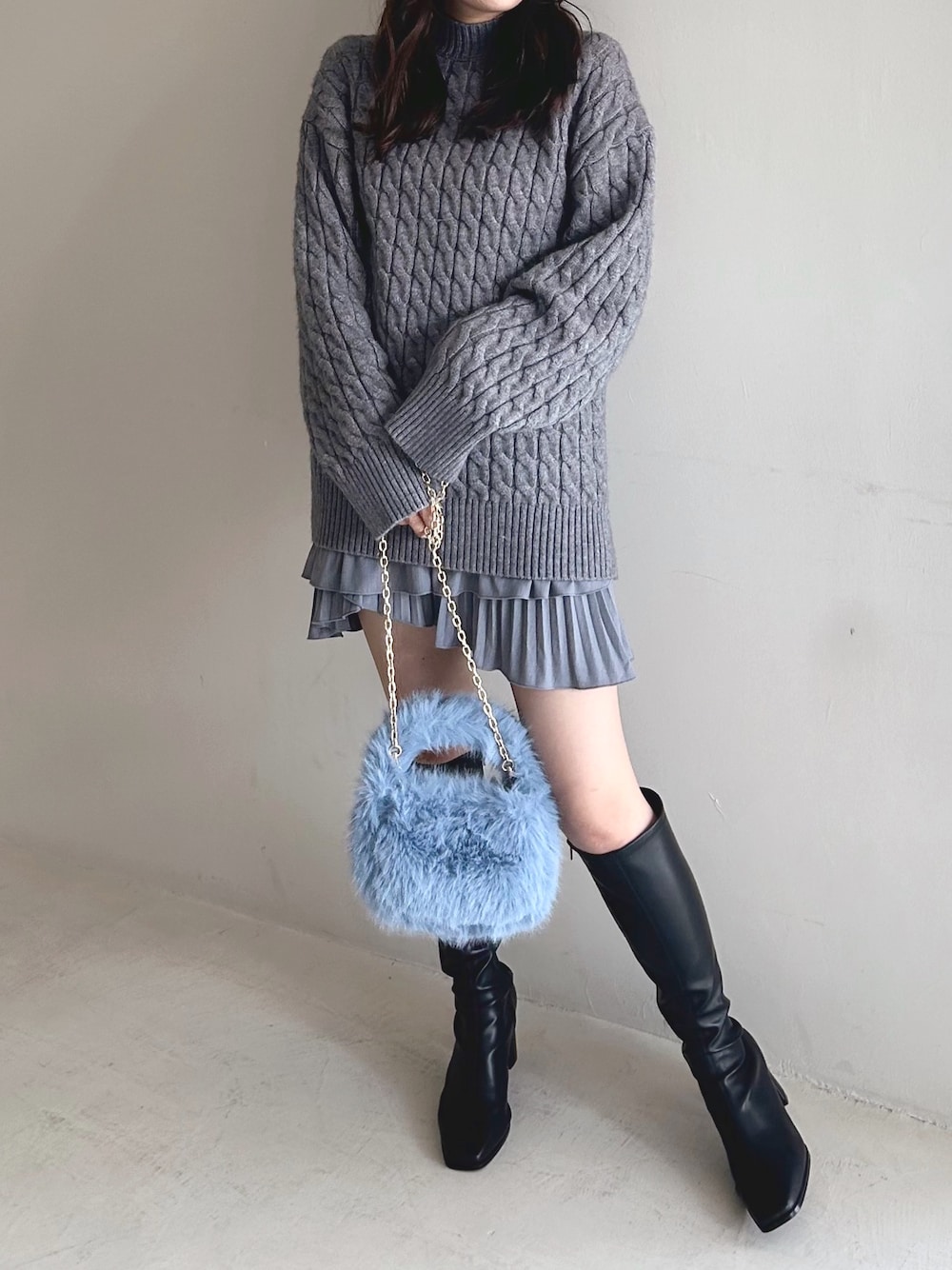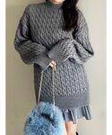 ミドル丈のニットはロングスカートやパンツ合わせももちろんですが、ミニ丈合わせもフェミニンでおすすめのスタイリング◎厚手なので冬も暖かく着用できる生地感です。ボトムはスカパン使用なのも嬉しいポイント。