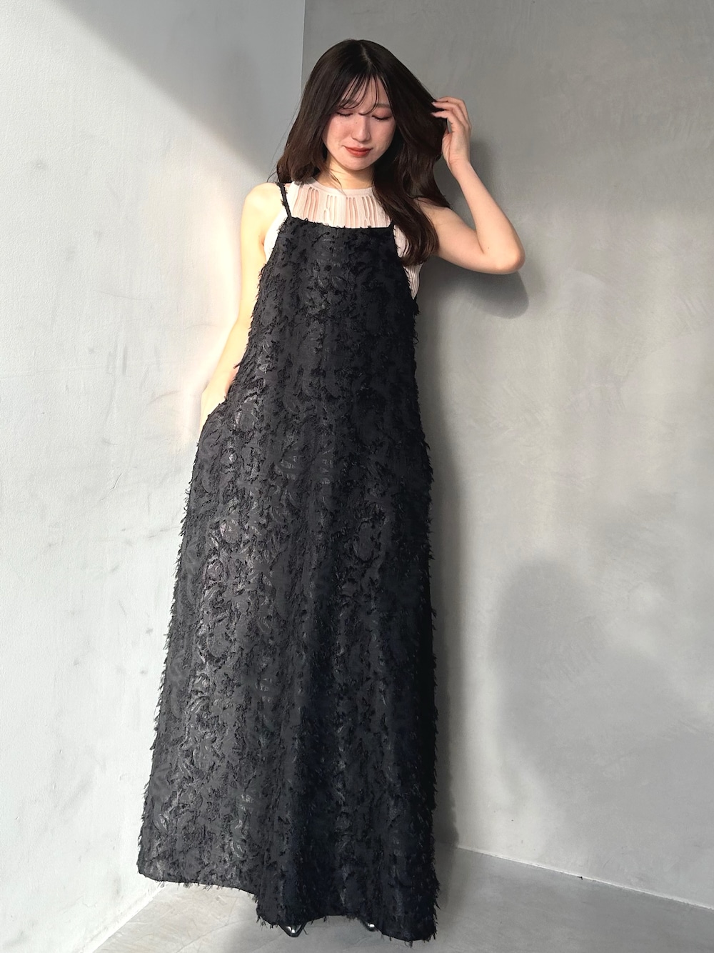 ジャガードが華やかな印象になるワンピース。1枚で可愛いので、シンプなインナーを合わせるだけでコーデが決まります。ボディラインを拾わずゆったり着れるのも嬉しいポイント。