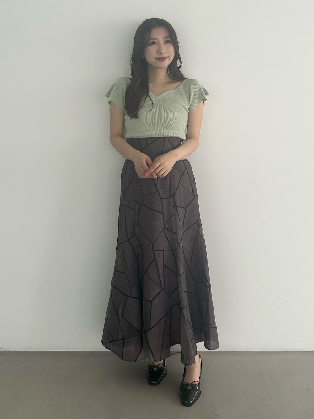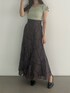 トップスはネックレス付きで360度可愛いデザイン。 外に少し広がったフレア袖なので、二の腕を細く見せてくれます。 合わせたボトムは他にないデザインのスカート。 花柄とマーブル模様やシアーデザインが甘すぎない大人フェミニンな印象に仕上げてくれます。