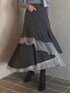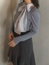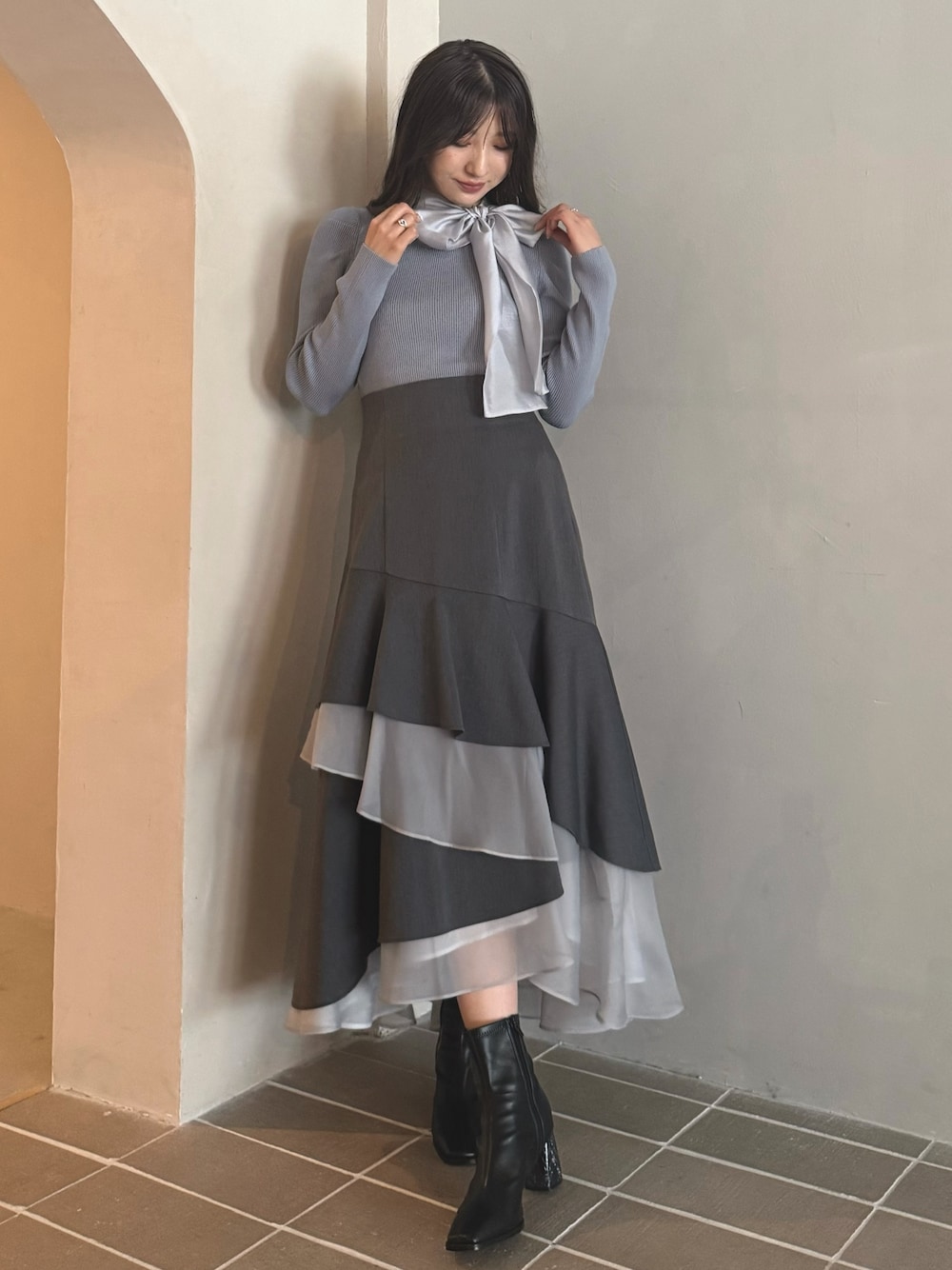 トップスのリボンは結ぶ位置を中央、サイドと変えていただけるデザイン。 より甘めに着たい方は真ん中リボンがおすすめです。 首元は少し肌見せされるので、抜け感があるのも嬉しいポイント。 スカートは人気アイテムに無地デザインが追加されましたもの。 チェックよりも落ち着いた印象になり、合わせやすく着回し力も◎